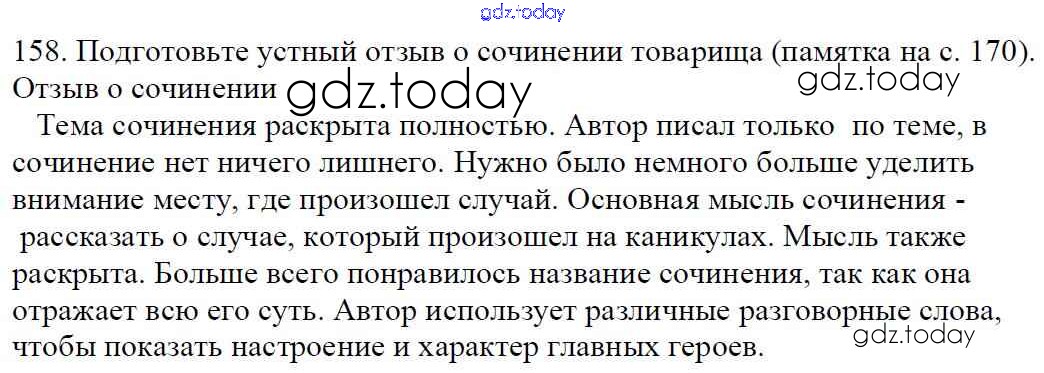 На страницах сайта gdz.today вы найдете учебный и вспомогательный материал, направленный на улучшения знаний школьной программы. ГДЗ - онлайн мир знаний Часть 1. Решение к упражнениям 158 Учебнику по Русскому языку для 5 класса Баранов, Ладыженская Просвещение, Просвещение 2016, 2019