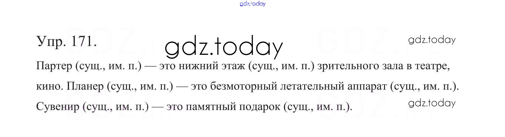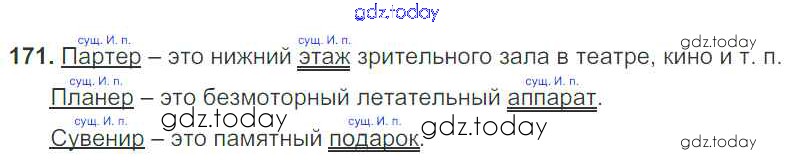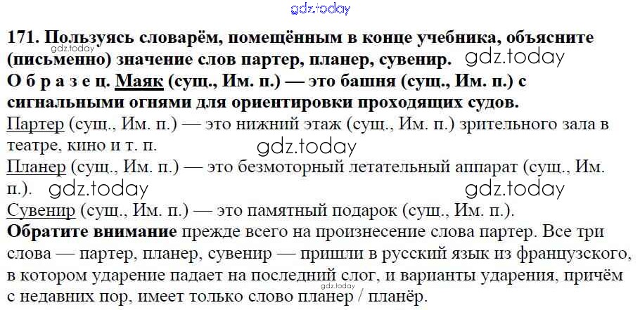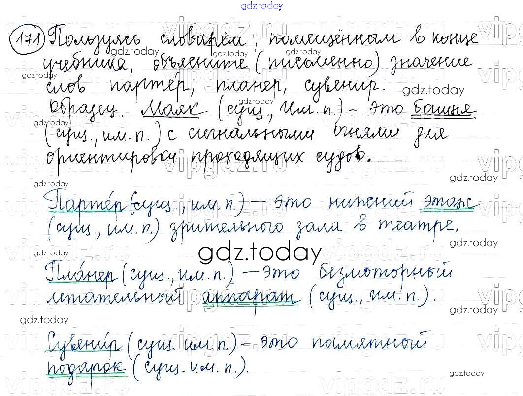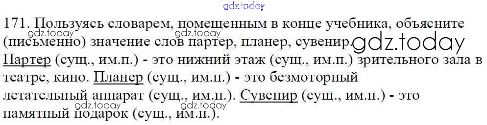 На страницах сайта gdz.today вы найдете учебный и вспомогательный материал, направленный на улучшения знаний школьной программы. ГДЗ - онлайн мир знаний Часть 1. Решение к упражнениям 171 Учебнику по Русскому языку для 5 класса Баранов, Ладыженская Просвещение, Просвещение 2016, 2019