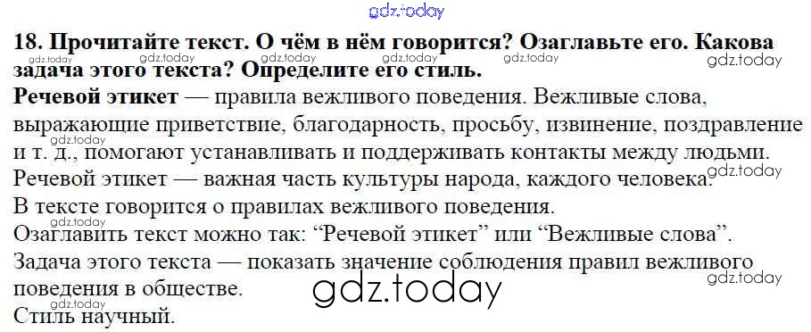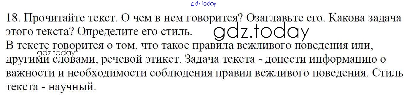 На страницах сайта gdz.today вы найдете учебный и вспомогательный материал, направленный на улучшения знаний школьной программы. ГДЗ - онлайн мир знаний Часть 1. Решение к упражнениям 18 Учебнику по Русскому языку для 5 класса Баранов, Ладыженская Просвещение, Просвещение 2016, 2019