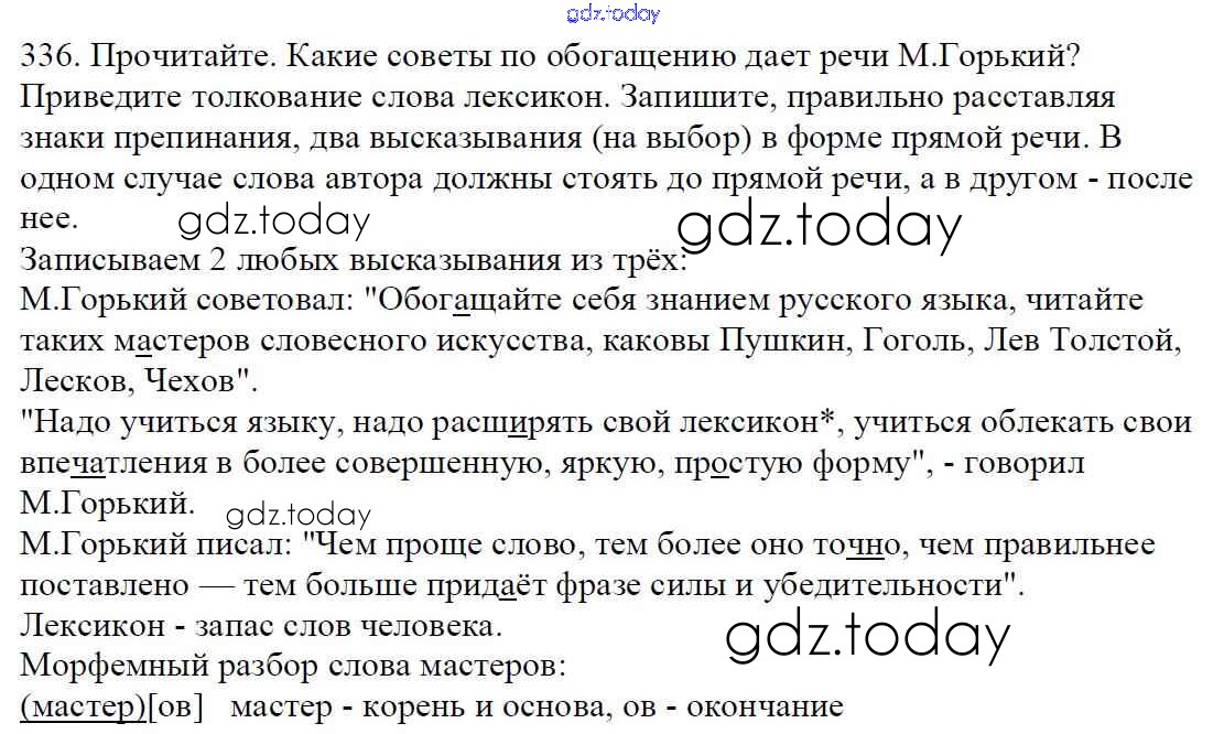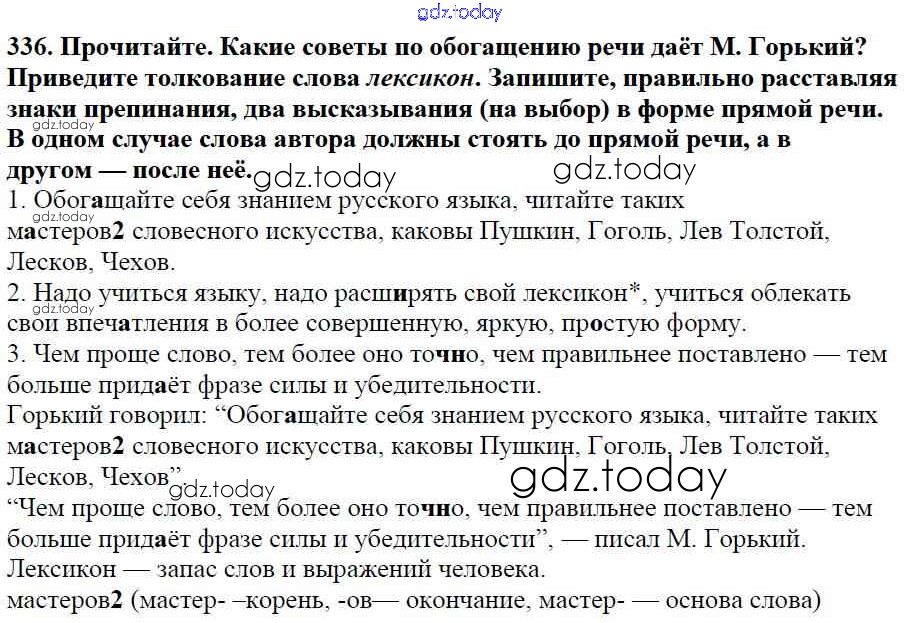 На страницах сайта gdz.today вы найдете учебный и вспомогательный материал, направленный на улучшения знаний школьной программы. ГДЗ - онлайн мир знаний Часть 1. Решение к упражнениям 336 Учебнику по Русскому языку для 5 класса Баранов, Ладыженская Просвещение, Просвещение 2016, 2019