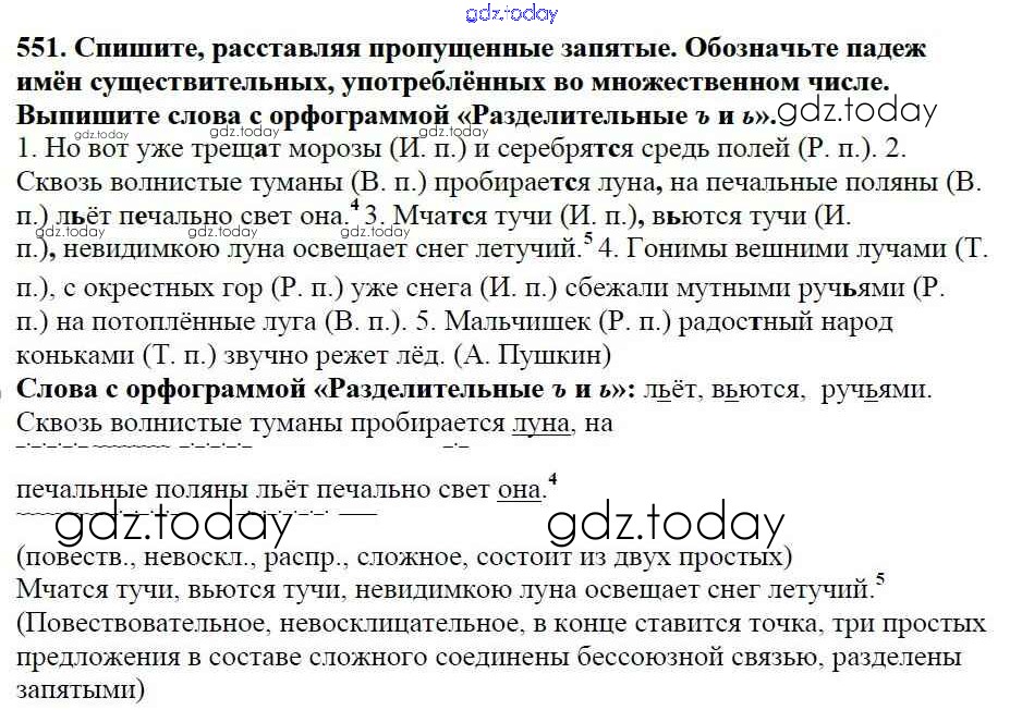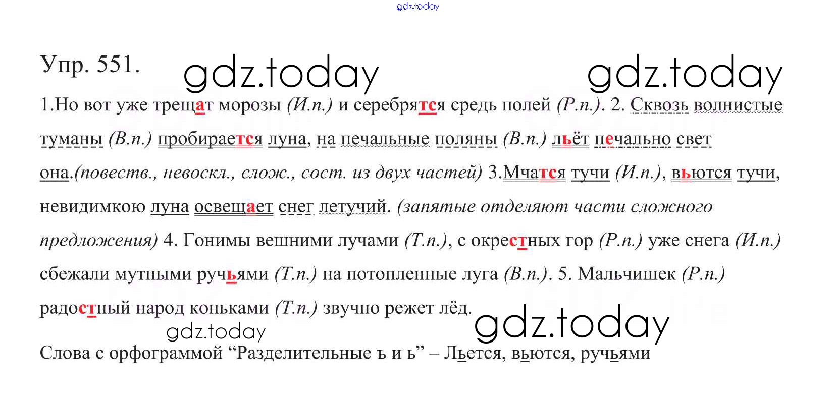 На страницах сайта gdz.today вы найдете учебный и вспомогательный материал, направленный на улучшения знаний школьной программы. ГДЗ - онлайн мир знаний Часть 2. Решение к упражнениям 551 Учебнику по Русскому языку для 5 класса Баранов, Ладыженская Просвещение, Просвещение 2016, 2019