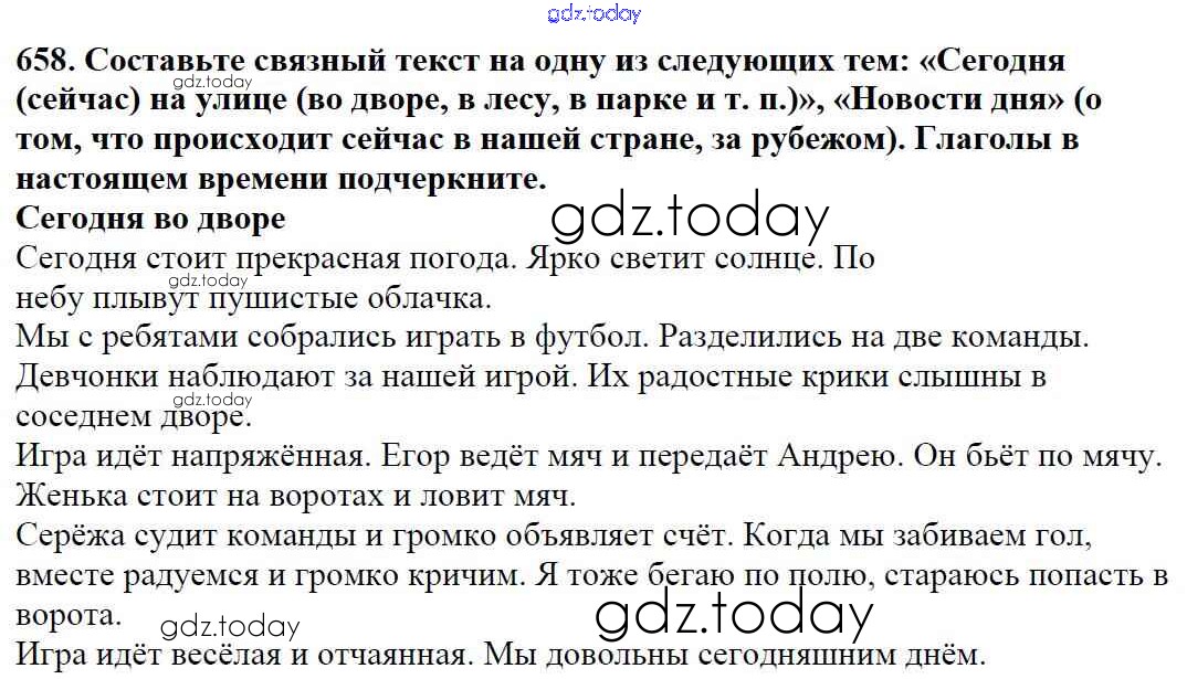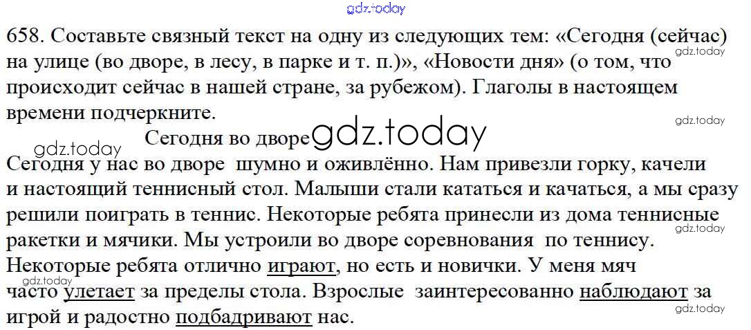 На страницах сайта gdz.today вы найдете учебный и вспомогательный материал, направленный на улучшения знаний школьной программы. ГДЗ - онлайн мир знаний Часть 2. Решение к упражнениям 658 Учебнику по Русскому языку для 5 класса Баранов, Ладыженская Просвещение, Просвещение 2016, 2019