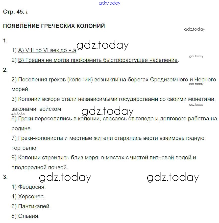 На страницах сайта gdz.today вы найдете учебный и вспомогательный материал, направленный на улучшения знаний школьной программы. ГДЗ - онлайн мир знаний Решение к теме 5. Жители и государства Древней Греции стр. 45 Рабочей тетради по Всеобщей истории для 5 класса Абрамов, Абрамова Дрофа Вертикаль 2019