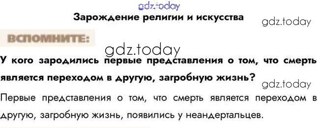 На страницах сайта gdz.today вы найдете учебный и вспомогательный материал, направленный на улучшения знаний школьной программы. ГДЗ - онлайн мир знаний Вспомните Зарождение религии и искусства 1 Учебнику по Всеобщей истории для 5 класса Уколова Просвещение Сферы 2019