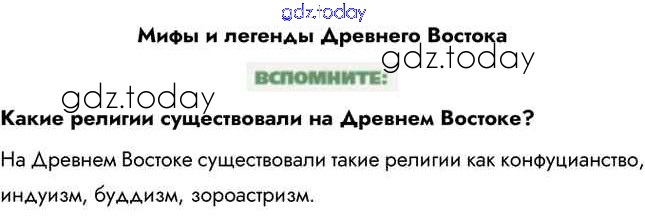 На страницах сайта gdz.today вы найдете учебный и вспомогательный материал, направленный на улучшения знаний школьной программы. ГДЗ - онлайн мир знаний Вспомните Мифы и легенды Древнего Востока 1 Учебнику по Всеобщей истории для 5 класса Уколова Просвещение Сферы 2019