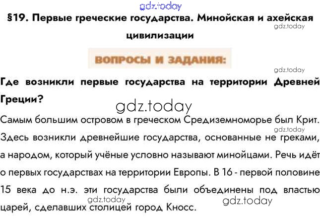 На страницах сайта gdz.today вы найдете учебный и вспомогательный материал, направленный на улучшения знаний школьной программы. ГДЗ - онлайн мир знаний Вопросы и задания Решение к §19 1 Учебнику по Всеобщей истории для 5 класса Уколова Просвещение Сферы 2019