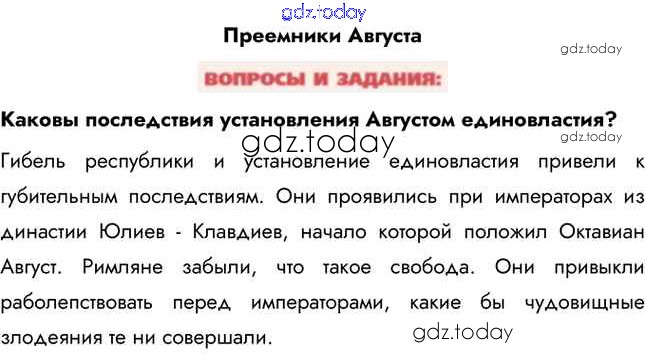 На страницах сайта gdz.today вы найдете учебный и вспомогательный материал, направленный на улучшения знаний школьной программы. ГДЗ - онлайн мир знаний Вопросы и задания Преемники Августа 1 Учебнику по Всеобщей истории для 5 класса Уколова Просвещение Сферы 2019