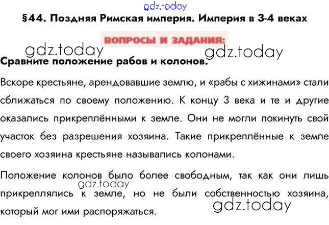 На страницах сайта gdz.today вы найдете учебный и вспомогательный материал, направленный на улучшения знаний школьной программы. ГДЗ - онлайн мир знаний Вопросы и задания Решение к §44 1 Учебнику по Всеобщей истории для 5 класса Уколова Просвещение Сферы 2019