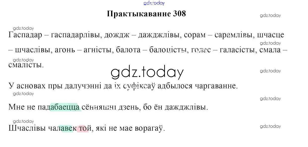 На страницах сайта gdz.today вы найдете учебный и вспомогательный материал, направленный на улучшения знаний школьной программы. ГДЗ - онлайн мир знаний Рашальнік да практыкаванняў 308 Учебнику по Белорусскому языку для 6 класса Валочка, Зелянко Национальный институт образования 2020