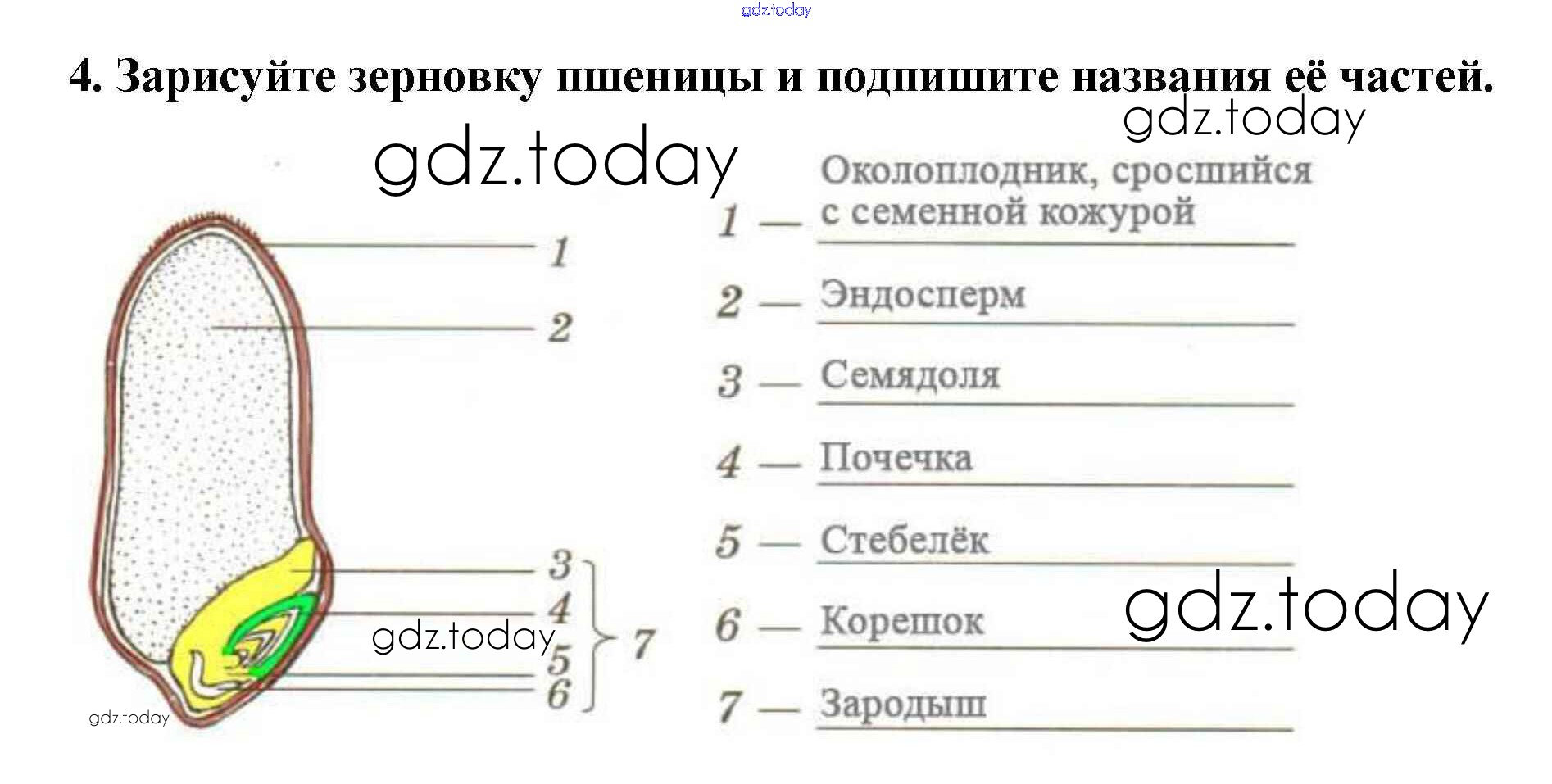 На страницах сайта gdz.today вы найдете учебный и вспомогательный материал, направленный на улучшения знаний школьной программы. ГДЗ - онлайн мир знаний Строение зерновки пшеницы Решение к §1. Строение семян 4 Учебнику по Биологии для 6 класса Пасечник Дрофа Вертикаль 2014