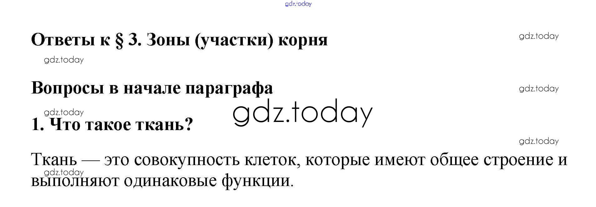 На страницах сайта gdz.today вы найдете учебный и вспомогательный материал, направленный на улучшения знаний школьной программы. ГДЗ - онлайн мир знаний Вопросы в начале параграфа Решение к §3. Зоны (участки) корня 1 Учебнику по Биологии для 6 класса Пасечник Дрофа Вертикаль 2014