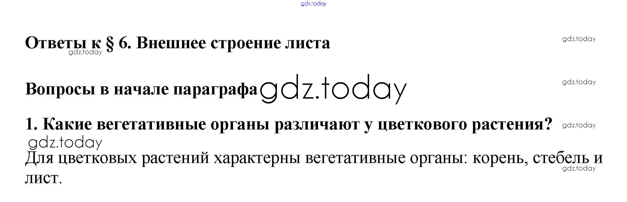 На страницах сайта gdz.today вы найдете учебный и вспомогательный материал, направленный на улучшения знаний школьной программы. ГДЗ - онлайн мир знаний Вопросы в начале параграфа Решение к §6. Внешнее строение листа 1 Учебнику по Биологии для 6 класса Пасечник Дрофа Вертикаль 2014