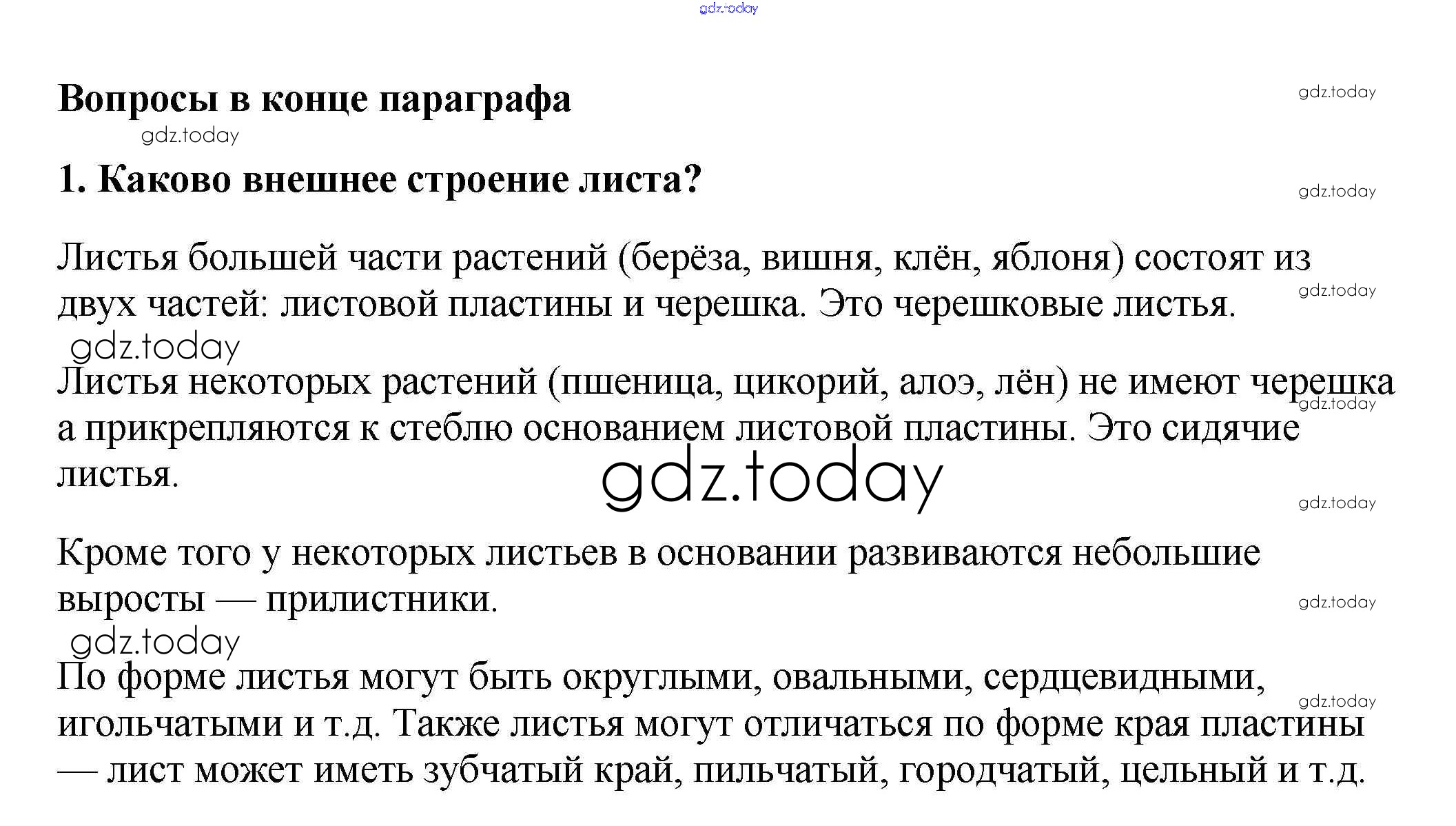 На страницах сайта gdz.today вы найдете учебный и вспомогательный материал, направленный на улучшения знаний школьной программы. ГДЗ - онлайн мир знаний Вопросы в конце параграфа Решение к §6. Внешнее строение листа 1 Учебнику по Биологии для 6 класса Пасечник Дрофа Вертикаль 2014