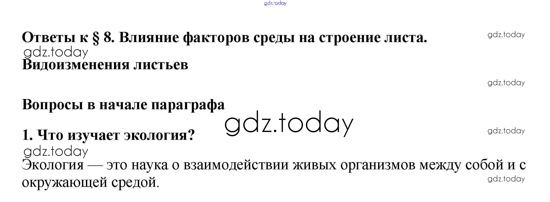 На страницах сайта gdz.today вы найдете учебный и вспомогательный материал, направленный на улучшения знаний школьной программы. ГДЗ - онлайн мир знаний Вопросы в начале параграфа Решение к §8. Влияние факторов среды на строение листа. Видоизменения листьев 1 Учебнику по Биологии для 6 класса Пасечник Дрофа Вертикаль 2014