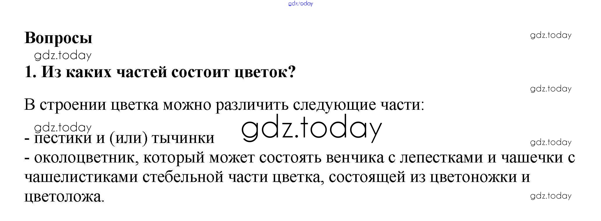 На страницах сайта gdz.today вы найдете учебный и вспомогательный материал, направленный на улучшения знаний школьной программы. ГДЗ - онлайн мир знаний Вопросы в конце параграфа Решение к §11. Цветок 1 Учебнику по Биологии для 6 класса Пасечник Дрофа Вертикаль 2014