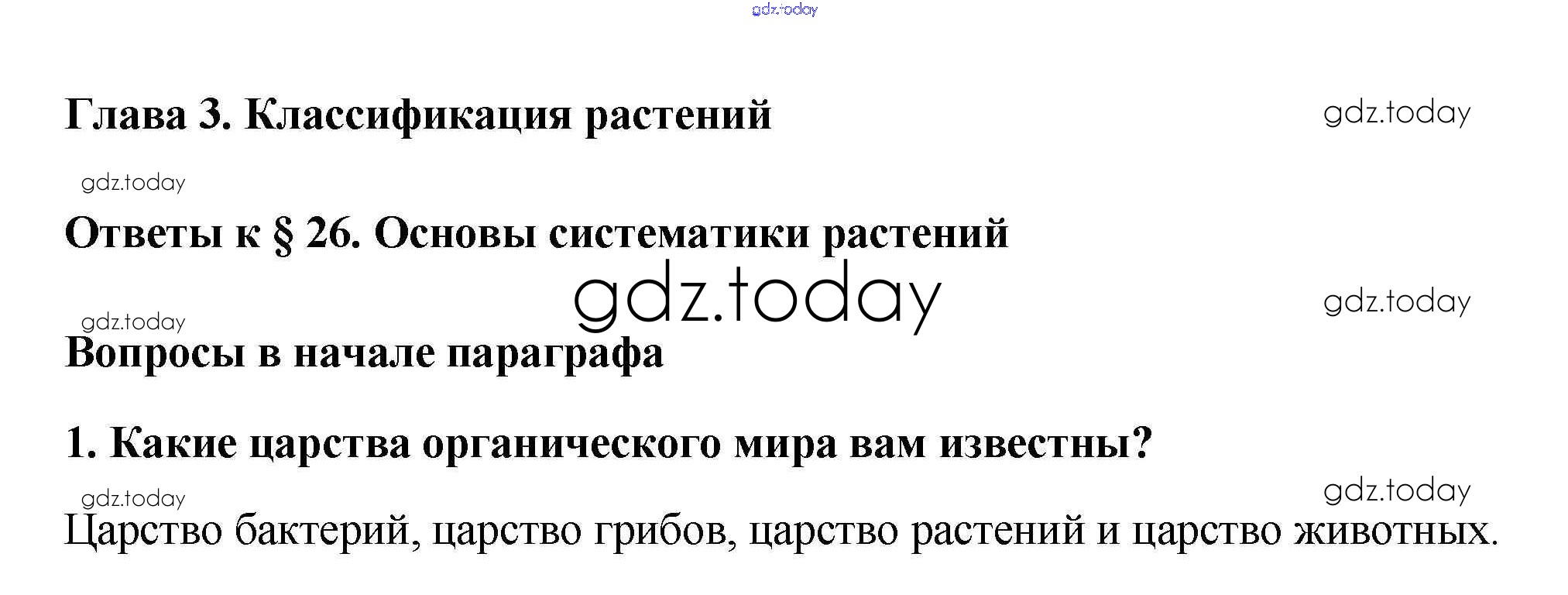 На страницах сайта gdz.today вы найдете учебный и вспомогательный материал, направленный на улучшения знаний школьной программы. ГДЗ - онлайн мир знаний Вопросы в начале параграфа Решение к §26. Основы систематики растений 1 Учебнику по Биологии для 6 класса Пасечник Дрофа Вертикаль 2014