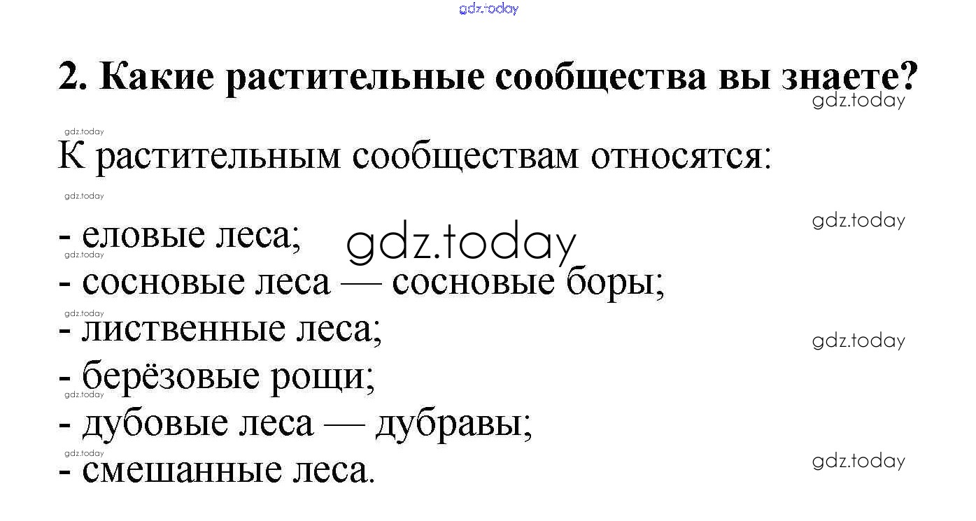 На страницах сайта gdz.today вы найдете учебный и вспомогательный материал, направленный на улучшения знаний школьной программы. ГДЗ - онлайн мир знаний Вопросы в конце параграфа Решение к §31. Растительные сообщества 2 Учебнику по Биологии для 6 класса Пасечник  Дрофа Вертикаль 2014