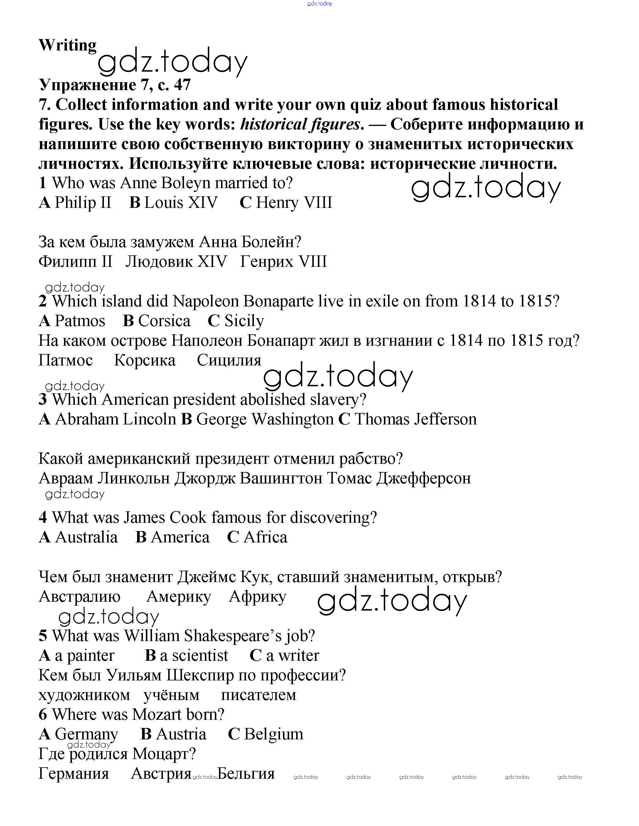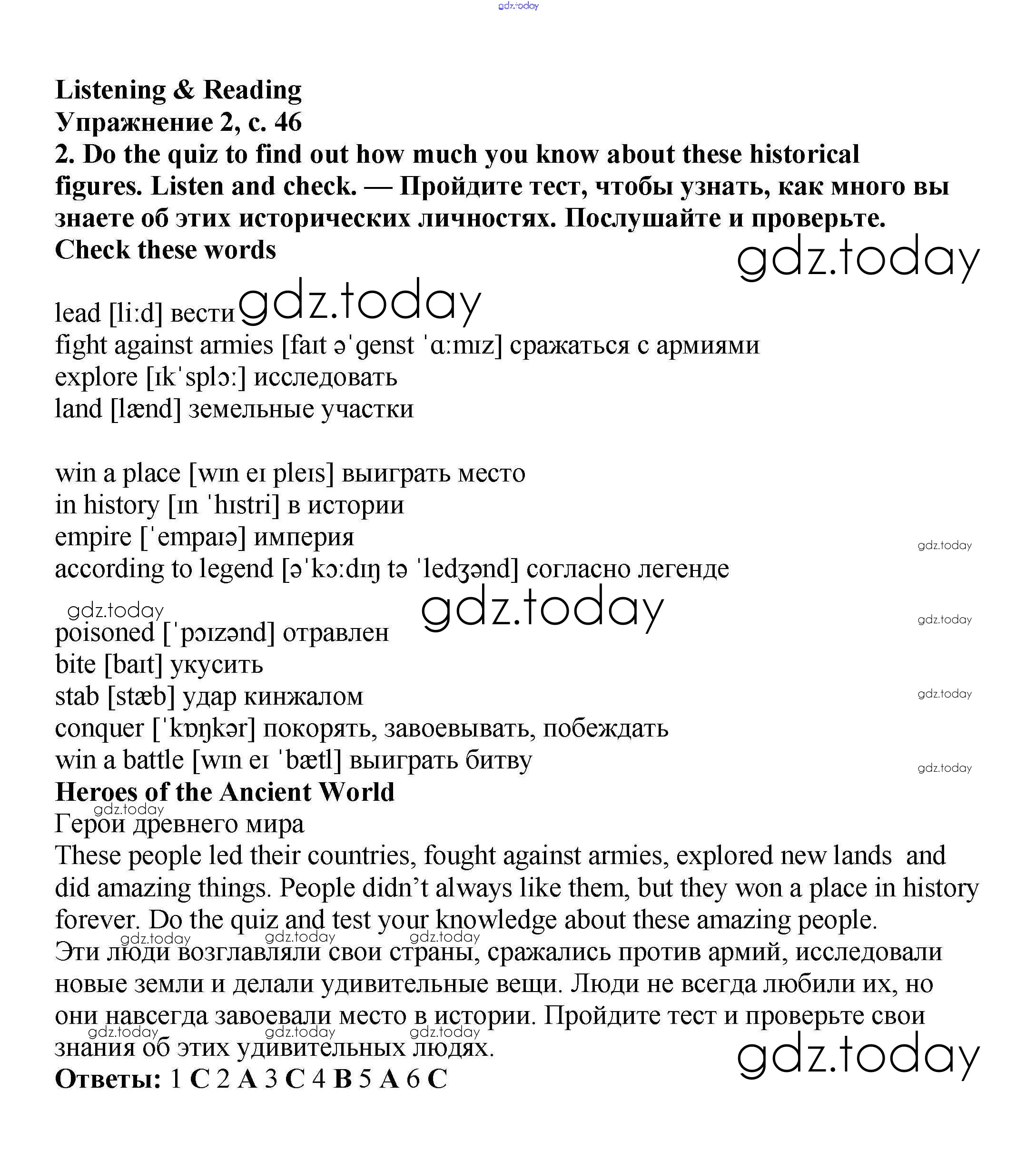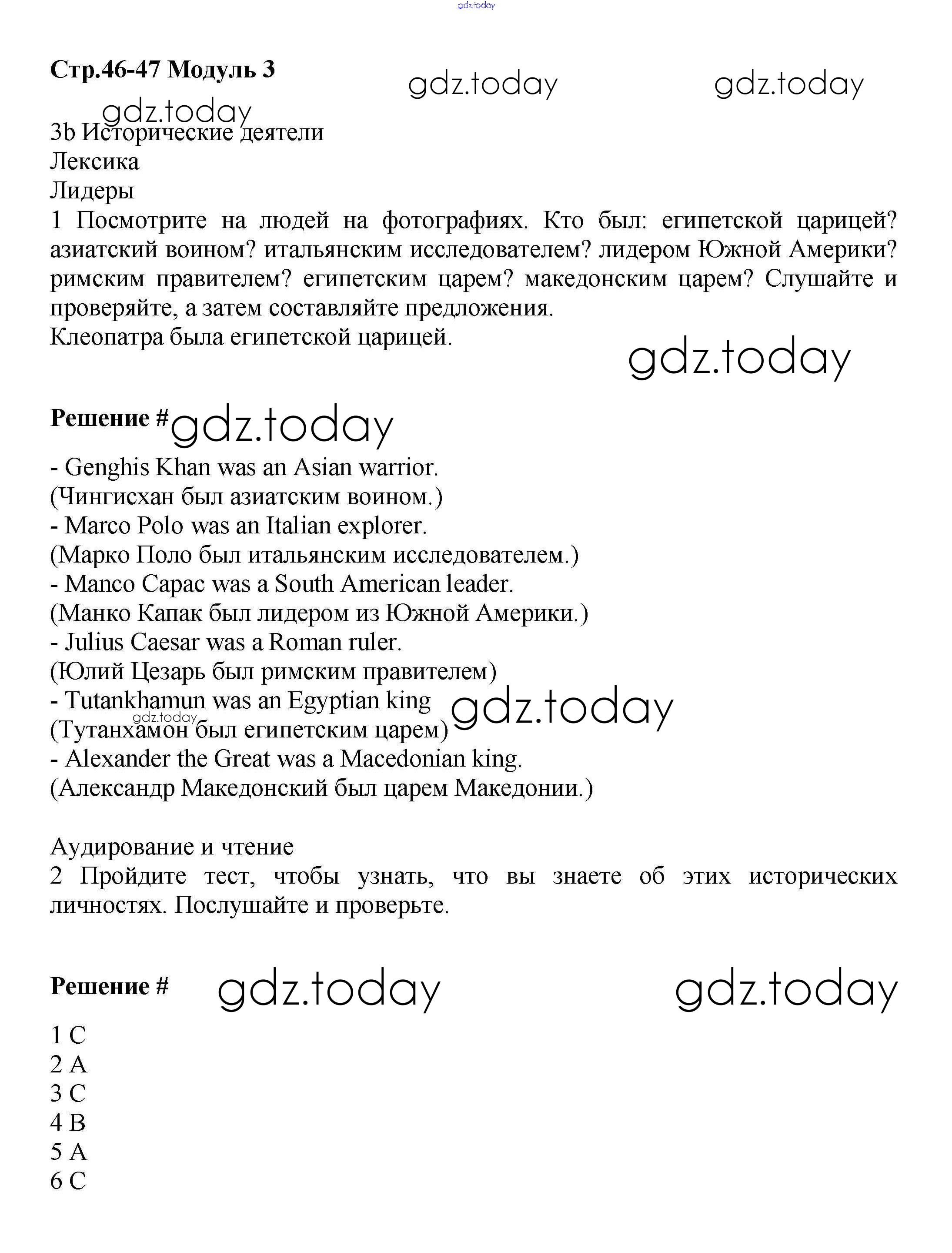 На страницах сайта gdz.today вы найдете учебный и вспомогательный материал, направленный на улучшения знаний школьной программы. ГДЗ - онлайн мир знаний Решение к Module 3. Great people & legends стр.46-47 Учебнику по Английскому языку для 6 класса Баранова, Дули Углубленный уровень Просвещение Starlight 2017