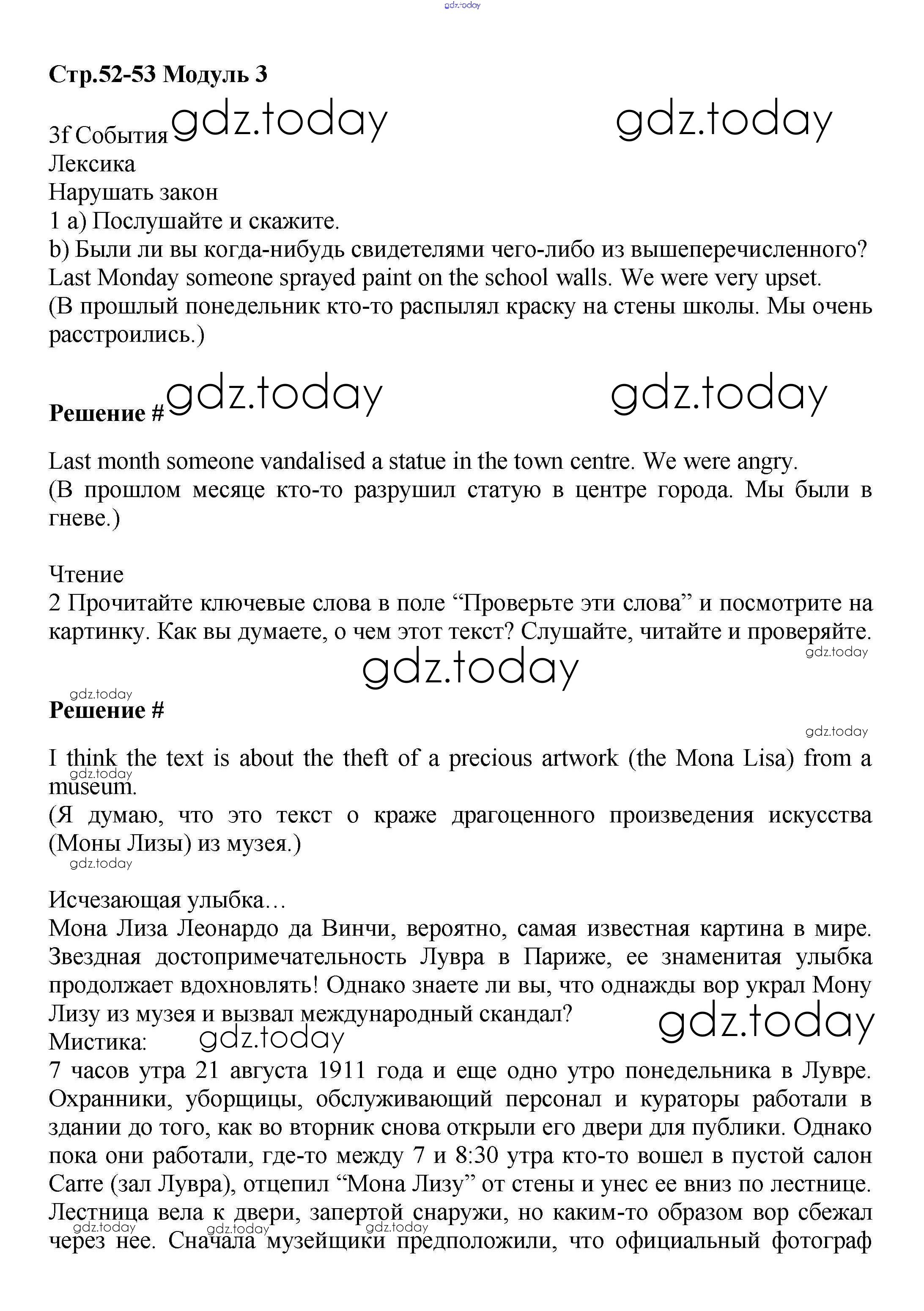 На страницах сайта gdz.today вы найдете учебный и вспомогательный материал, направленный на улучшения знаний школьной программы. ГДЗ - онлайн мир знаний Решение к Module 3. Great people & legends стр.52-53 Учебнику по Английскому языку для 6 класса Баранова, Дули Углубленный уровень Просвещение Starlight 2017