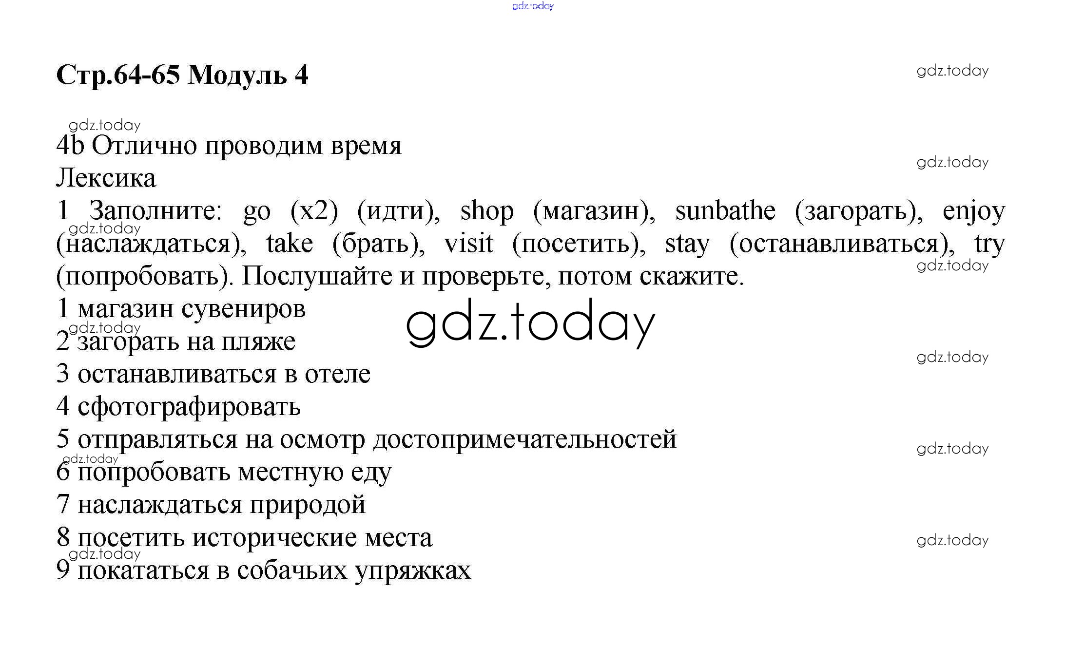 На страницах сайта gdz.today вы найдете учебный и вспомогательный материал, направленный на улучшения знаний школьной программы. ГДЗ - онлайн мир знаний Решение к Module 4. On holiday стр.64-65 Учебнику по Английскому языку для 6 класса Баранова, Дули Углубленный уровень Просвещение Starlight 2017