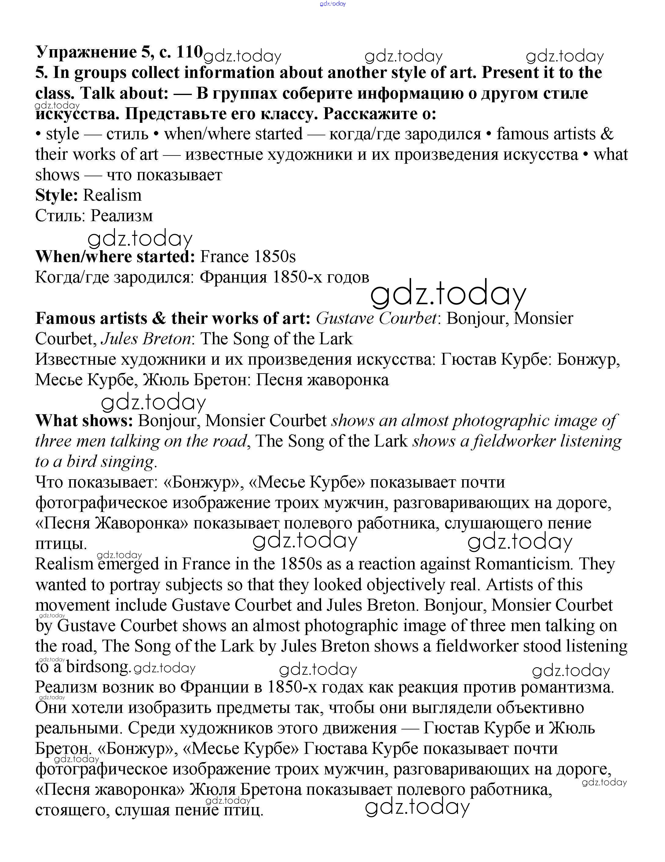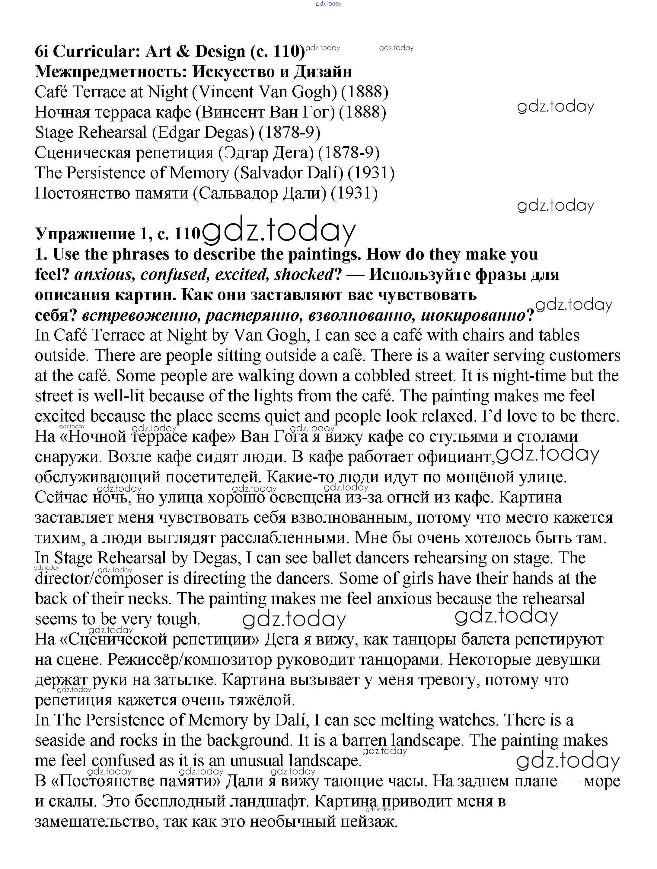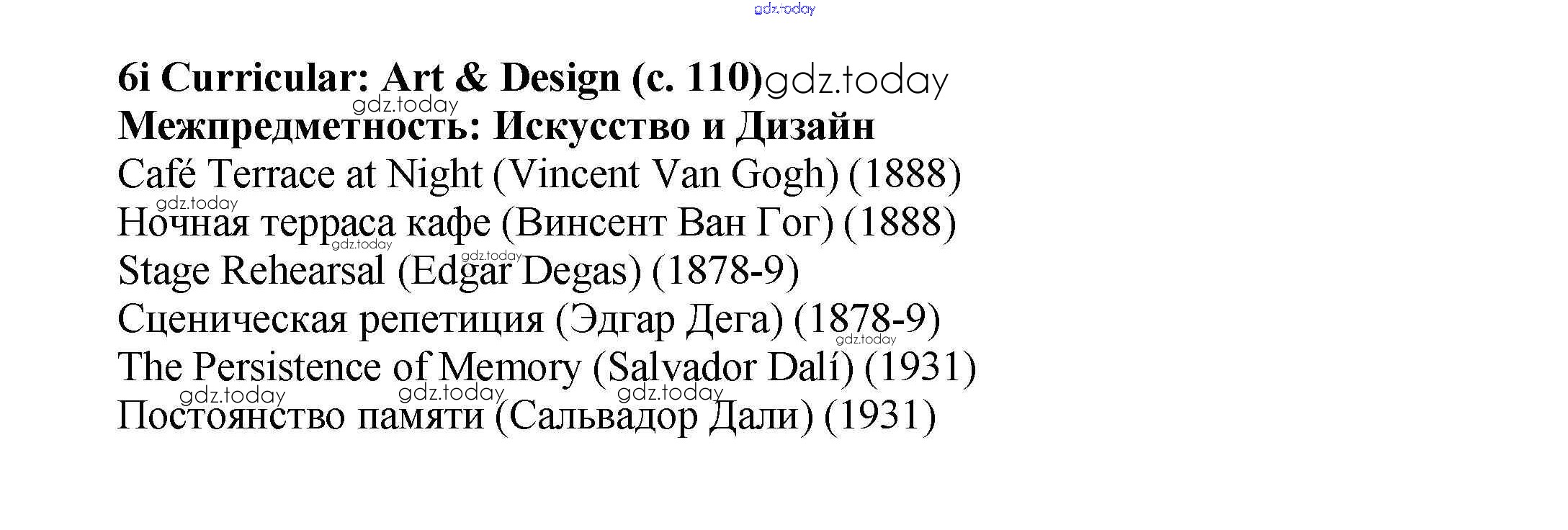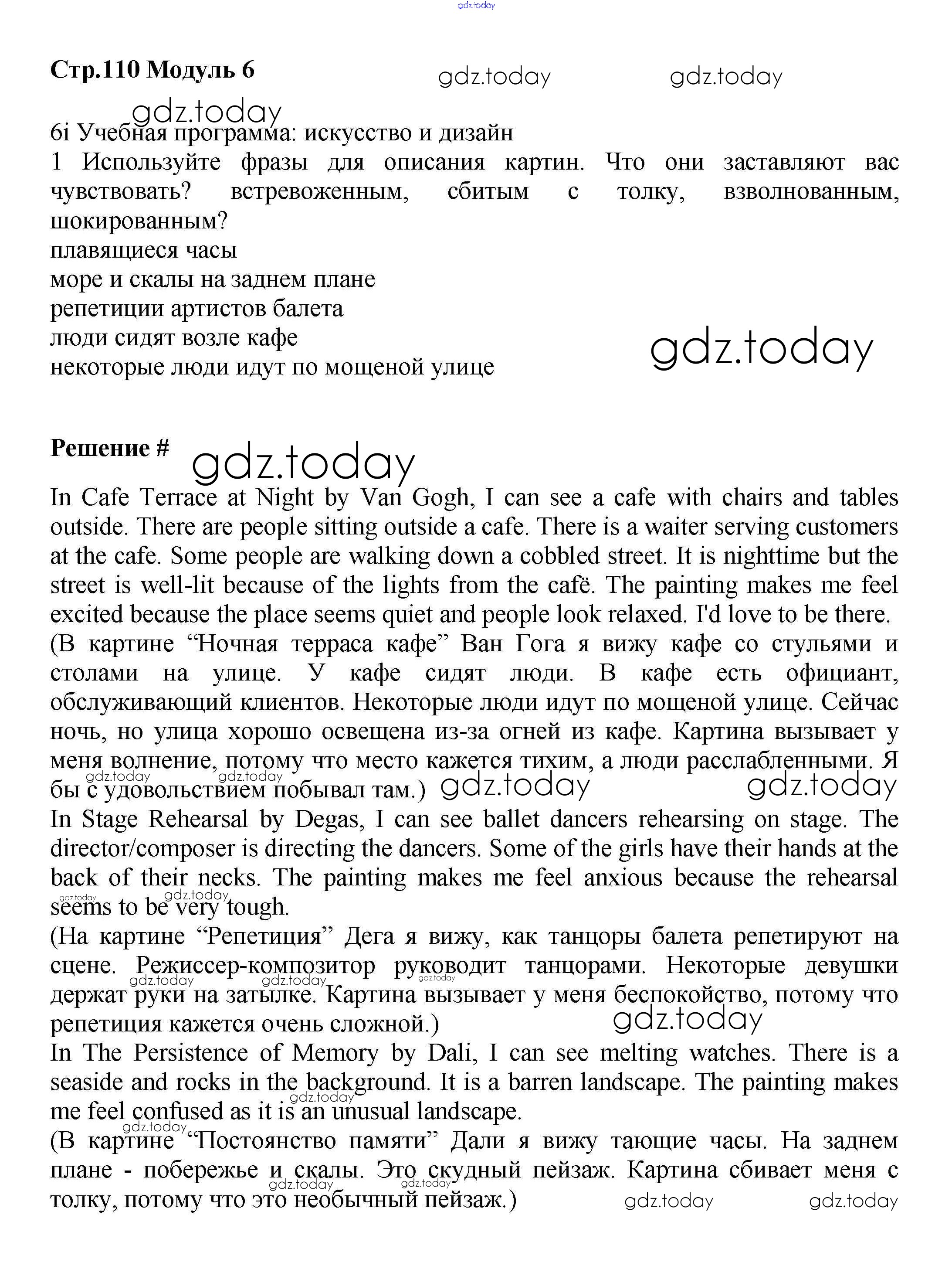 На страницах сайта gdz.today вы найдете учебный и вспомогательный материал, направленный на улучшения знаний школьной программы. ГДЗ - онлайн мир знаний Решение к Module 6. Art & Culture стр.110 Учебнику по Английскому языку для 6 класса Баранова, Дули Углубленный уровень Просвещение Starlight 2017
