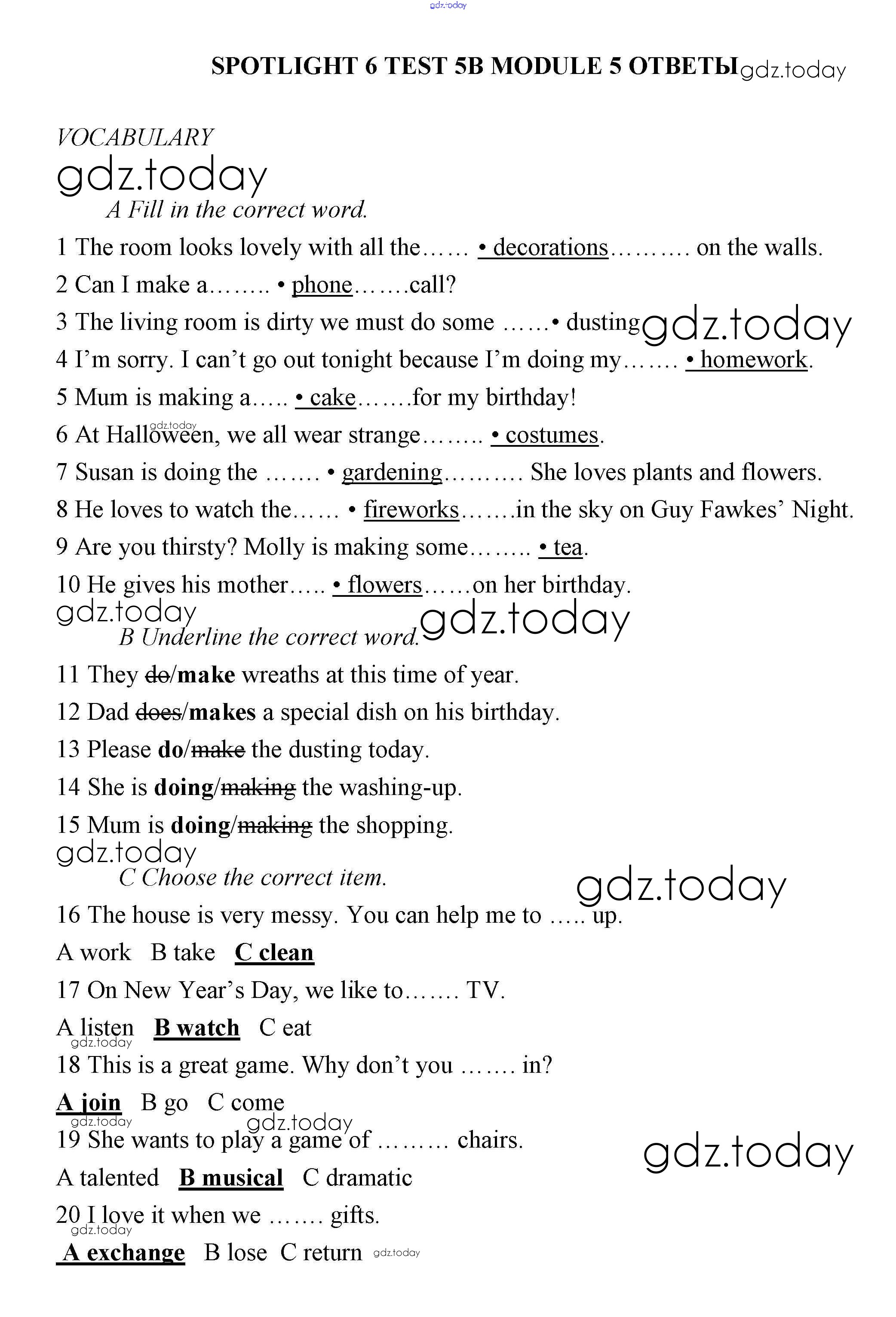 На страницах сайта gdz.today вы найдете учебный и вспомогательный материал, направленный на улучшения знаний школьной программы. ГДЗ - онлайн мир знаний Решение. Тесты 5В Контрольным заданиям по Английскому языку для 6 класса Дули, Ваулина Просвещение Spotlight 2017