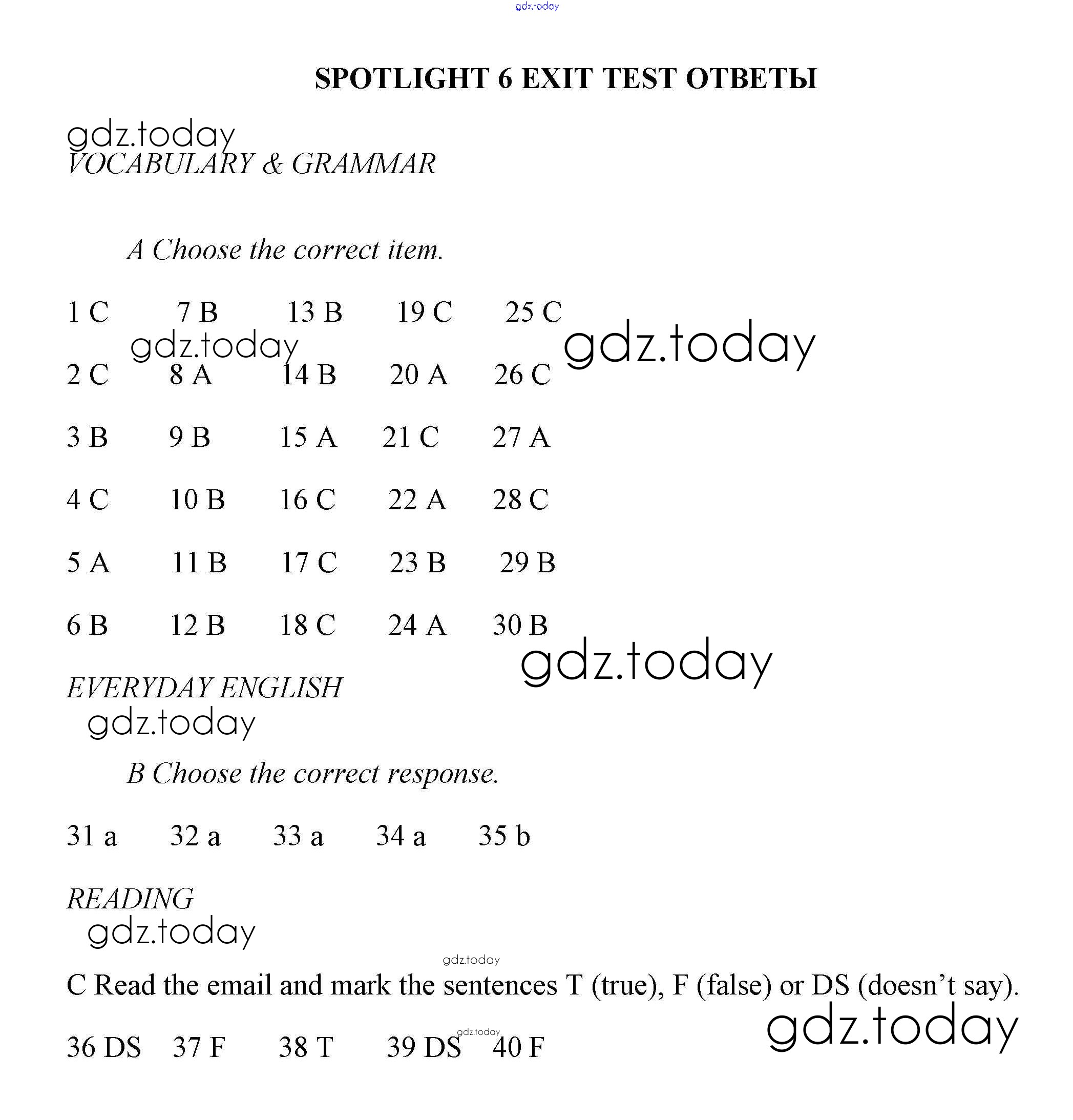 На страницах сайта gdz.today вы найдете учебный и вспомогательный материал, направленный на улучшения знаний школьной программы. ГДЗ - онлайн мир знаний Решение. Тесты Exit Контрольным заданиям по Английскому языку для 6 класса Дули, Ваулина Просвещение Spotlight 2017