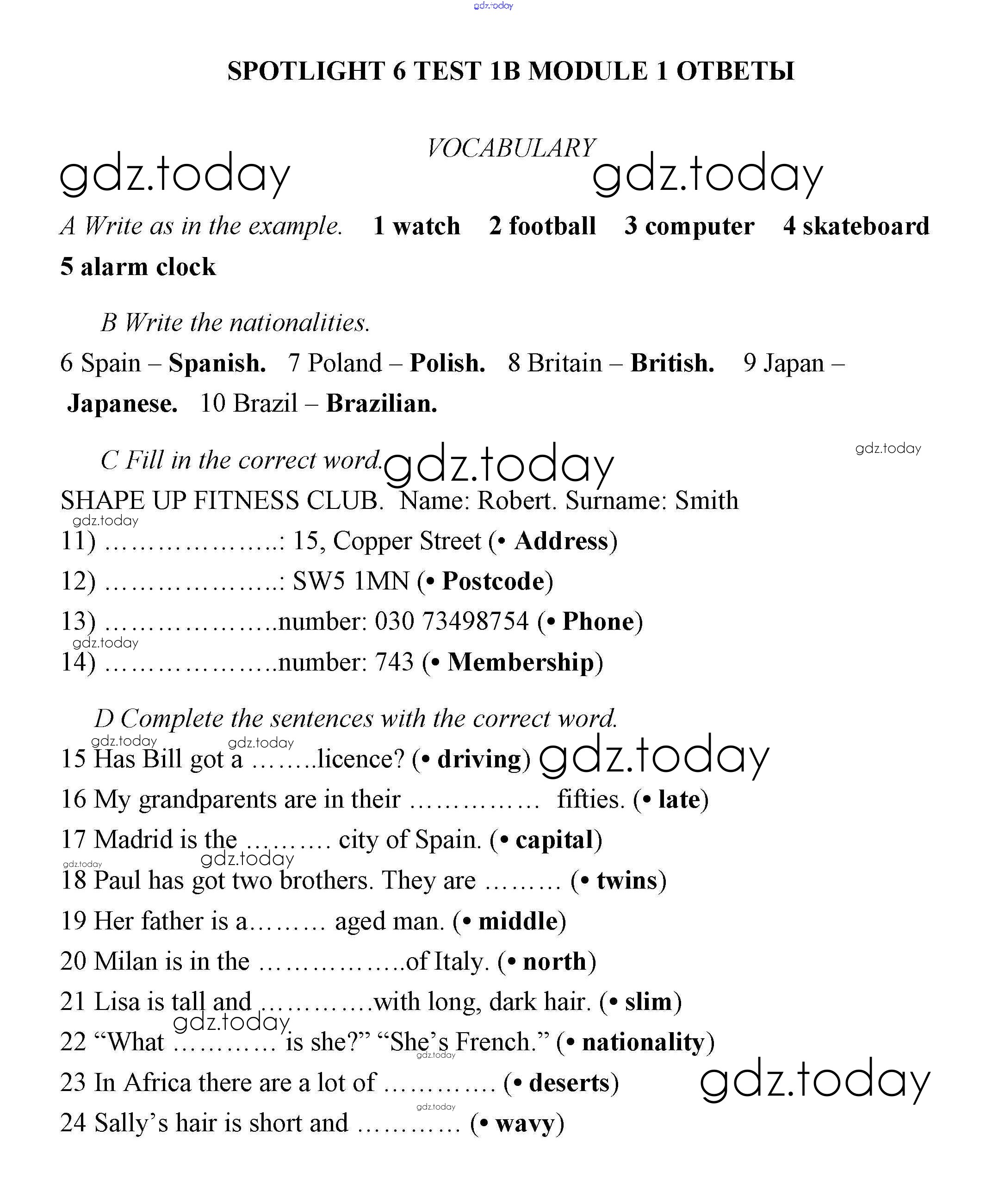 На страницах сайта gdz.today вы найдете учебный и вспомогательный материал, направленный на улучшения знаний школьной программы. ГДЗ - онлайн мир знаний Решение. Тесты 1В Контрольным заданиям по Английскому языку для 6 класса Дули, Ваулина Просвещение Spotlight 2017
