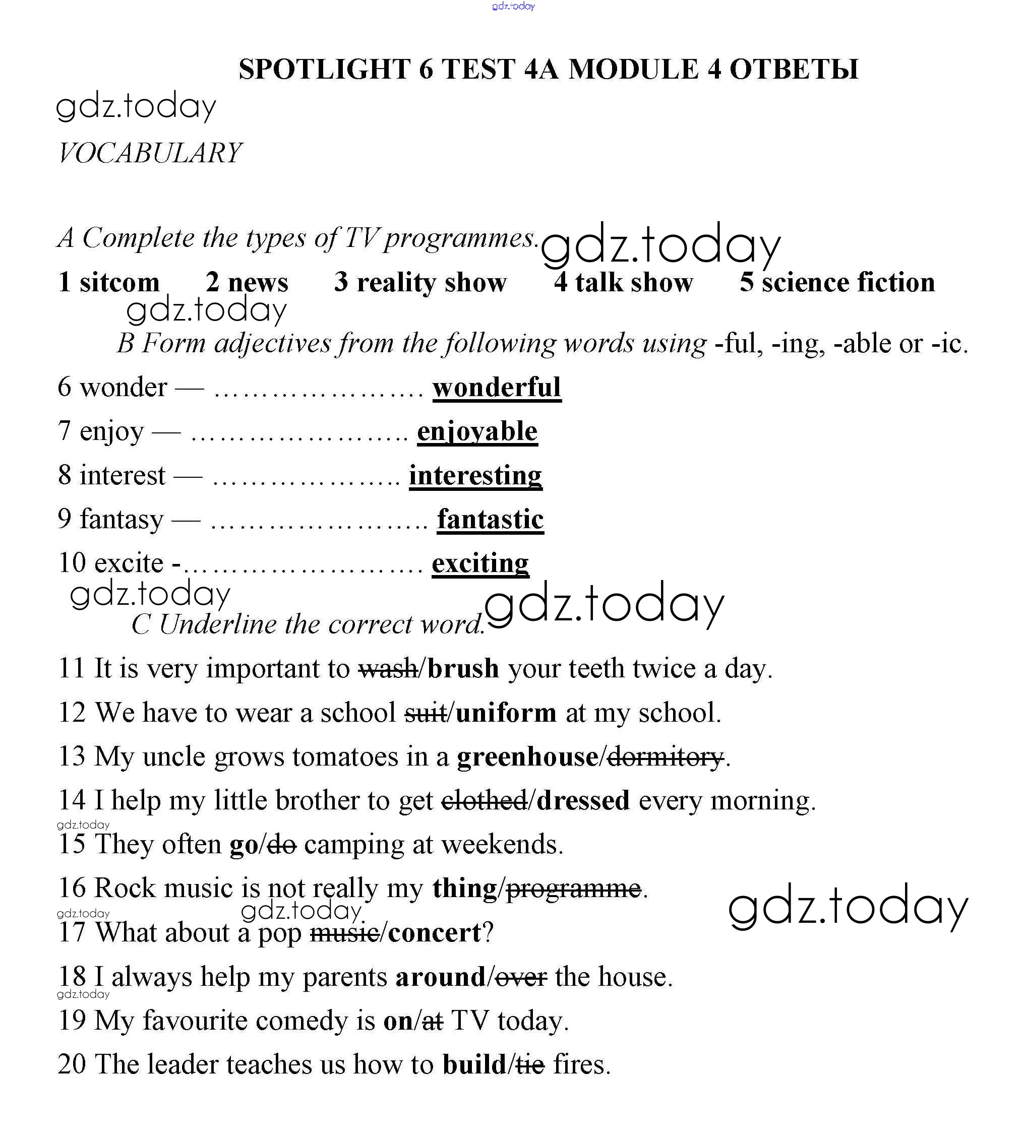 Ответы к Решение. Тесты 4А Контрольным заданиям по Английскому языку для 6 класса Дули, Ваулина Просвещение Spotlight 2017