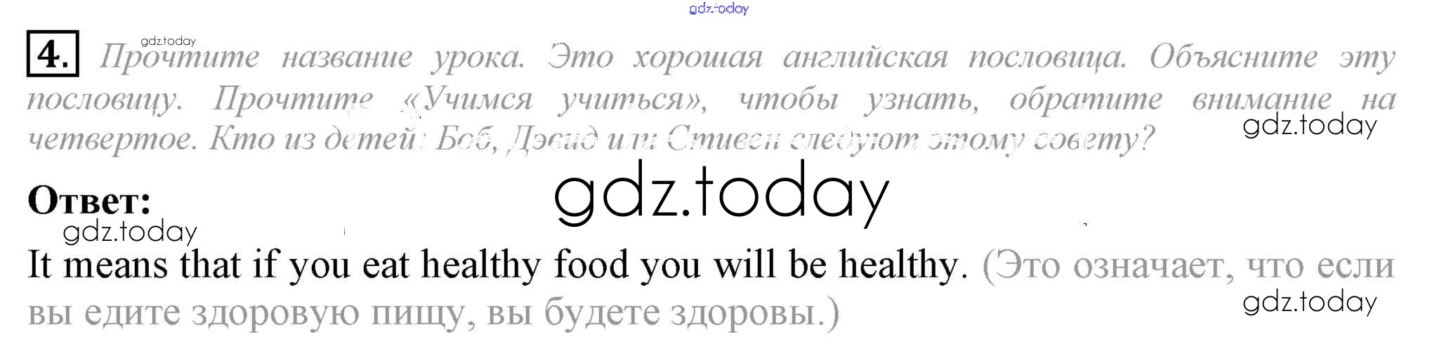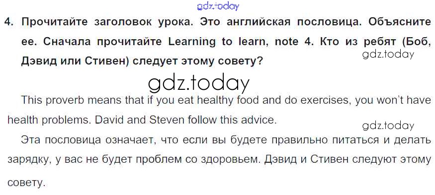 На страницах сайта gdz.today вы найдете учебный и вспомогательный материал, направленный на улучшения знаний школьной программы. ГДЗ - онлайн мир знаний Lesson 6 Решение к Unit 5. Do you care about your health? 4 Учебнику по Английскому языку для 6 класса Кузовлев, Лапа Просвещение Академический школьный учебник 2014