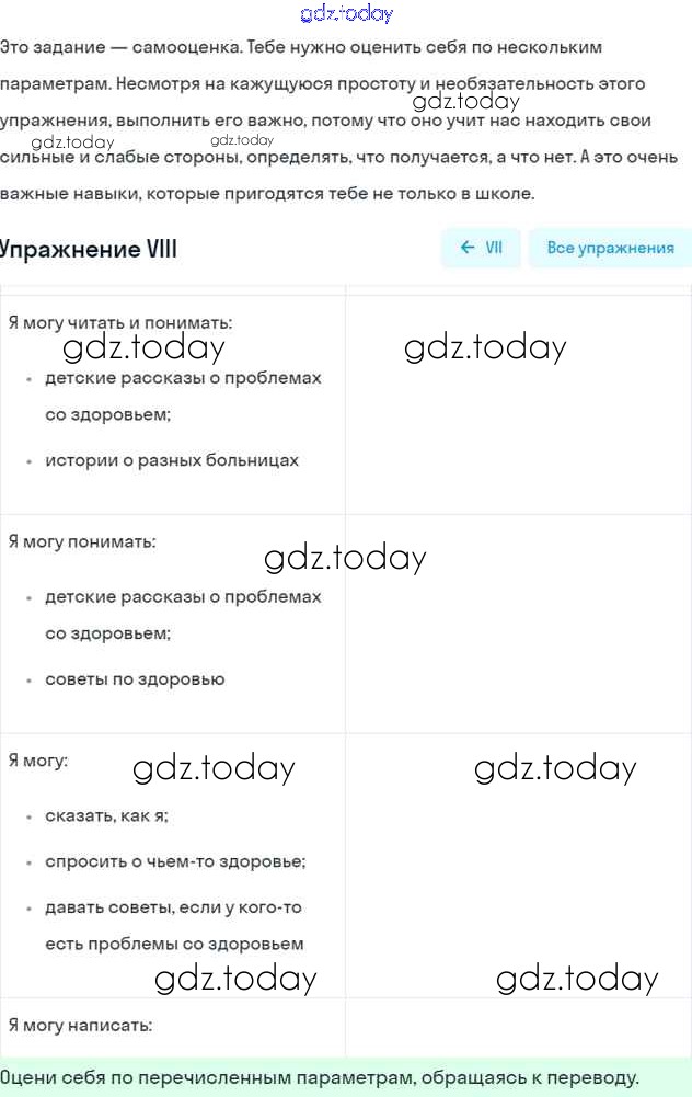 На страницах сайта gdz.today вы найдете учебный и вспомогательный материал, направленный на улучшения знаний школьной программы. ГДЗ - онлайн мир знаний Lesson 9-10 Решение к Unit 5. Do you care about your health? 8 Учебнику по Английскому языку для 6 класса Кузовлев, Лапа Просвещение Академический школьный учебник 2014