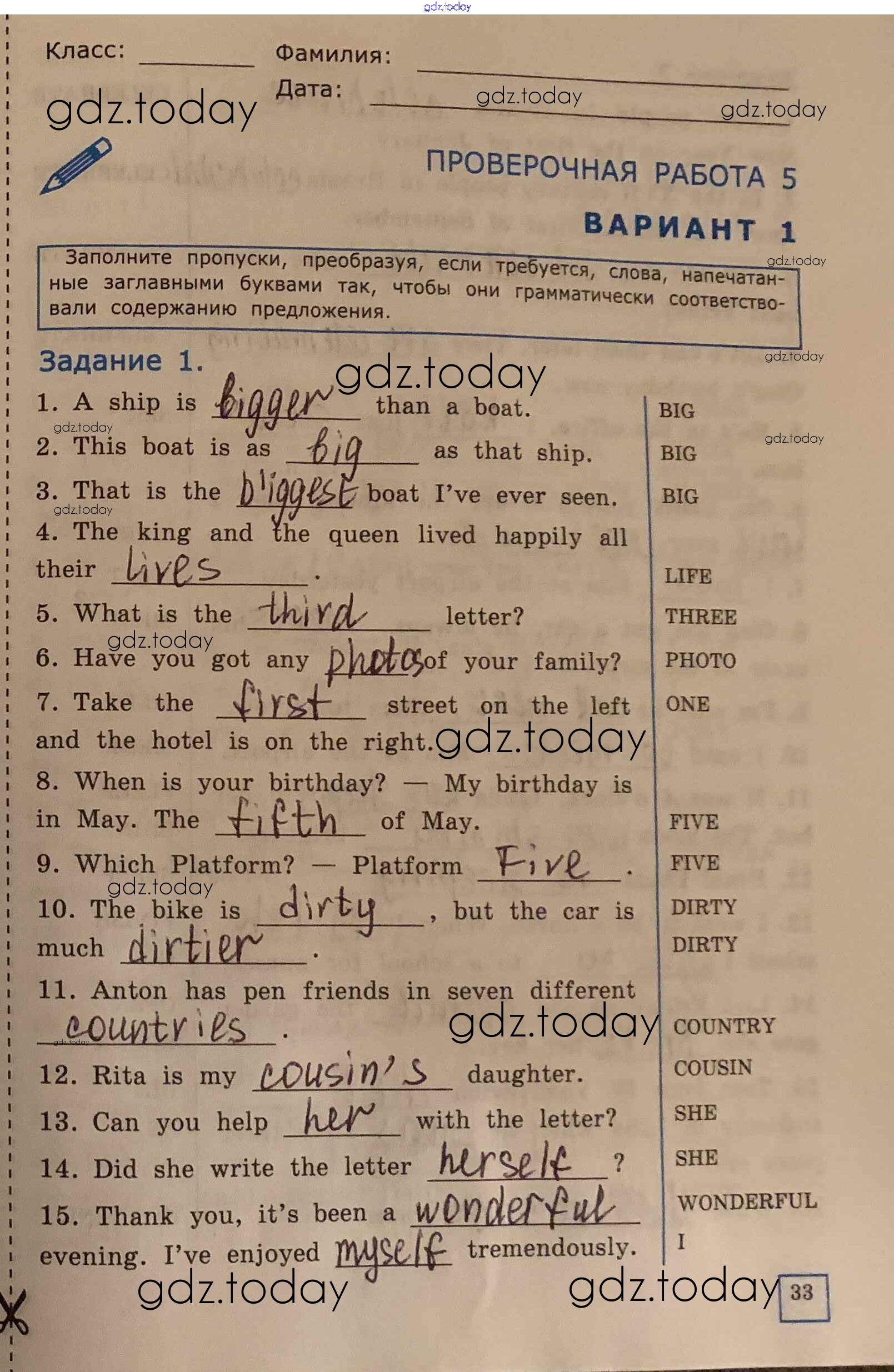 На страницах сайта gdz.today вы найдете учебный и вспомогательный материал, направленный на улучшения знаний школьной программы. ГДЗ - онлайн мир знаний Решение к проверочной работе №5 вариант 1 Проверочным работам по Английскому языку для 6 класса Барашкова Экзамен УМК 2017
