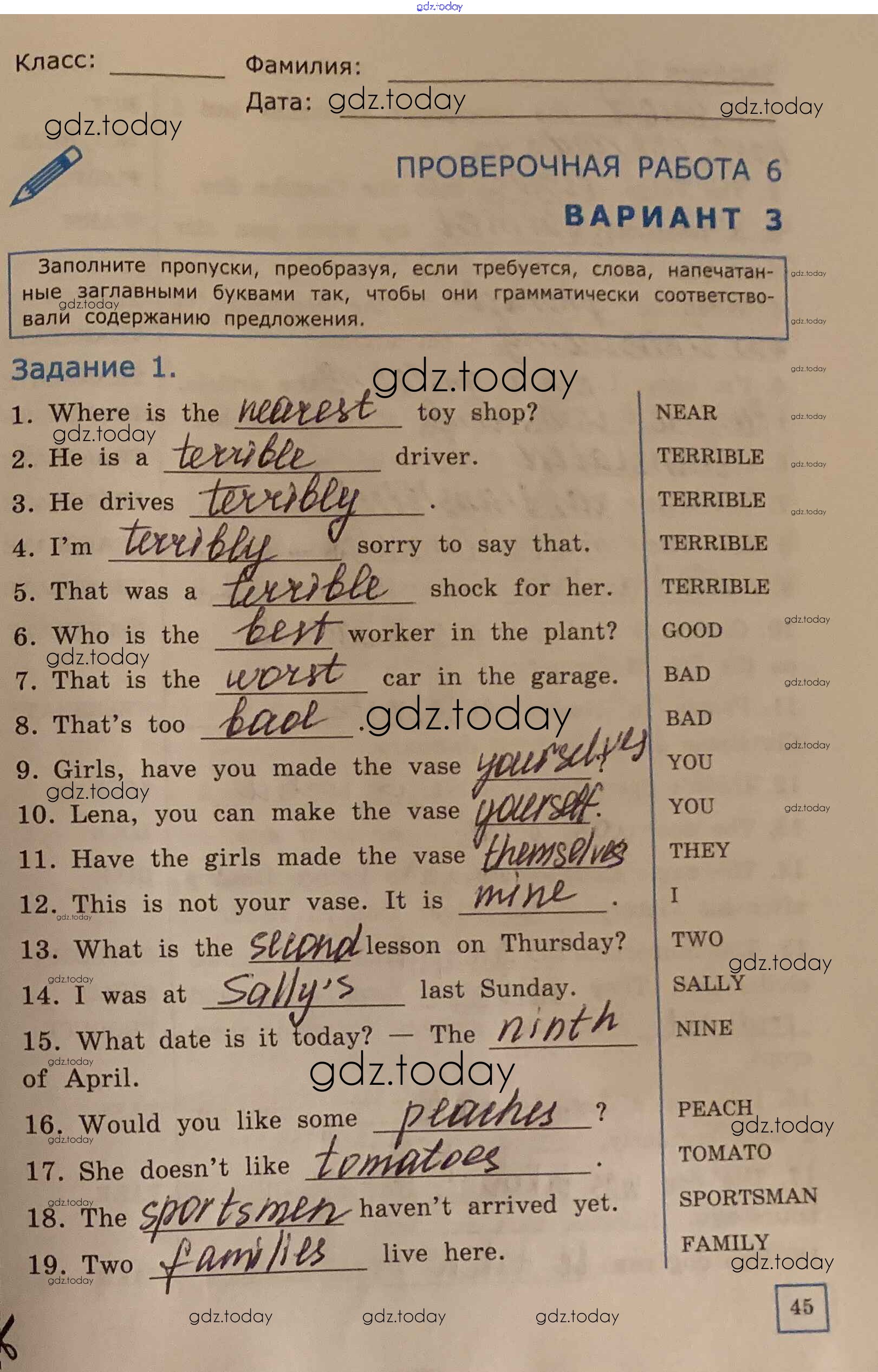 На страницах сайта gdz.today вы найдете учебный и вспомогательный материал, направленный на улучшения знаний школьной программы. ГДЗ - онлайн мир знаний Решение к проверочной работе №6 вариант 3 Проверочным работам по Английскому языку для 6 класса Барашкова Экзамен УМК 2017
