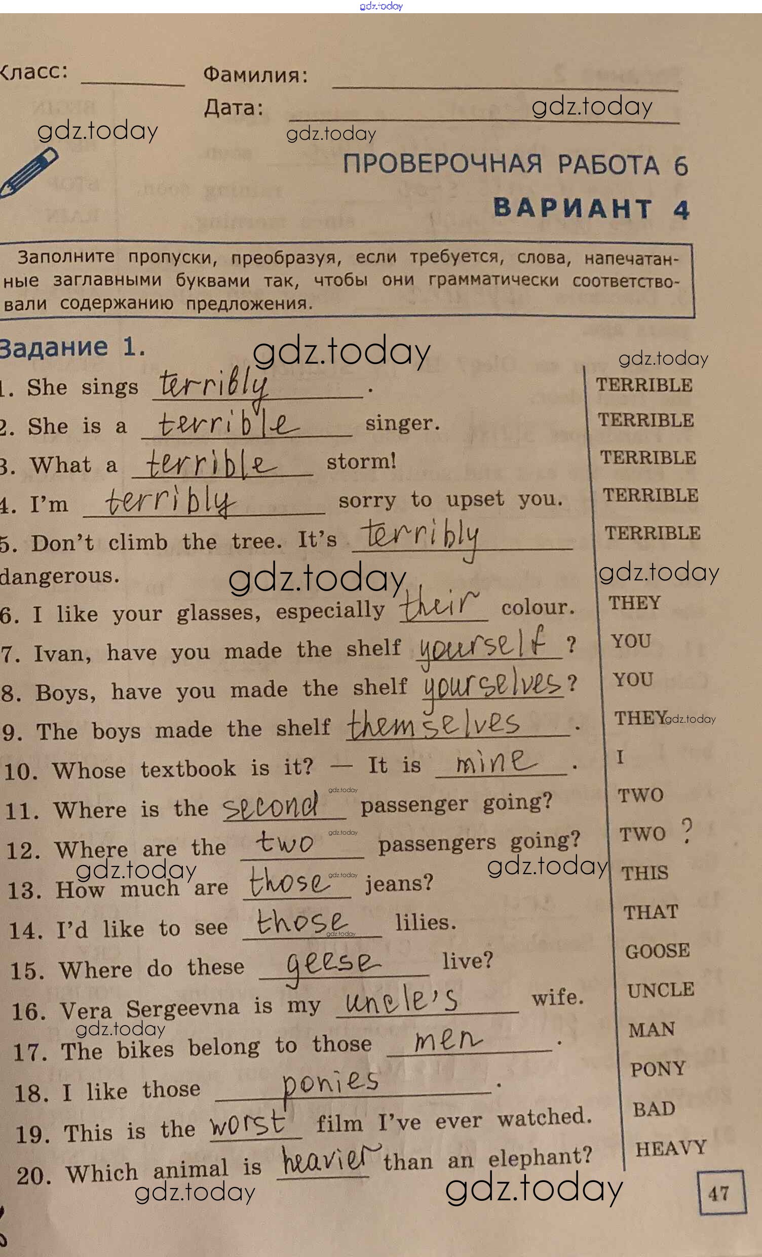 На страницах сайта gdz.today вы найдете учебный и вспомогательный материал, направленный на улучшения знаний школьной программы. ГДЗ - онлайн мир знаний Решение к проверочной работе №6 вариант 4 Проверочным работам по Английскому языку для 6 класса Барашкова Экзамен УМК 2017
