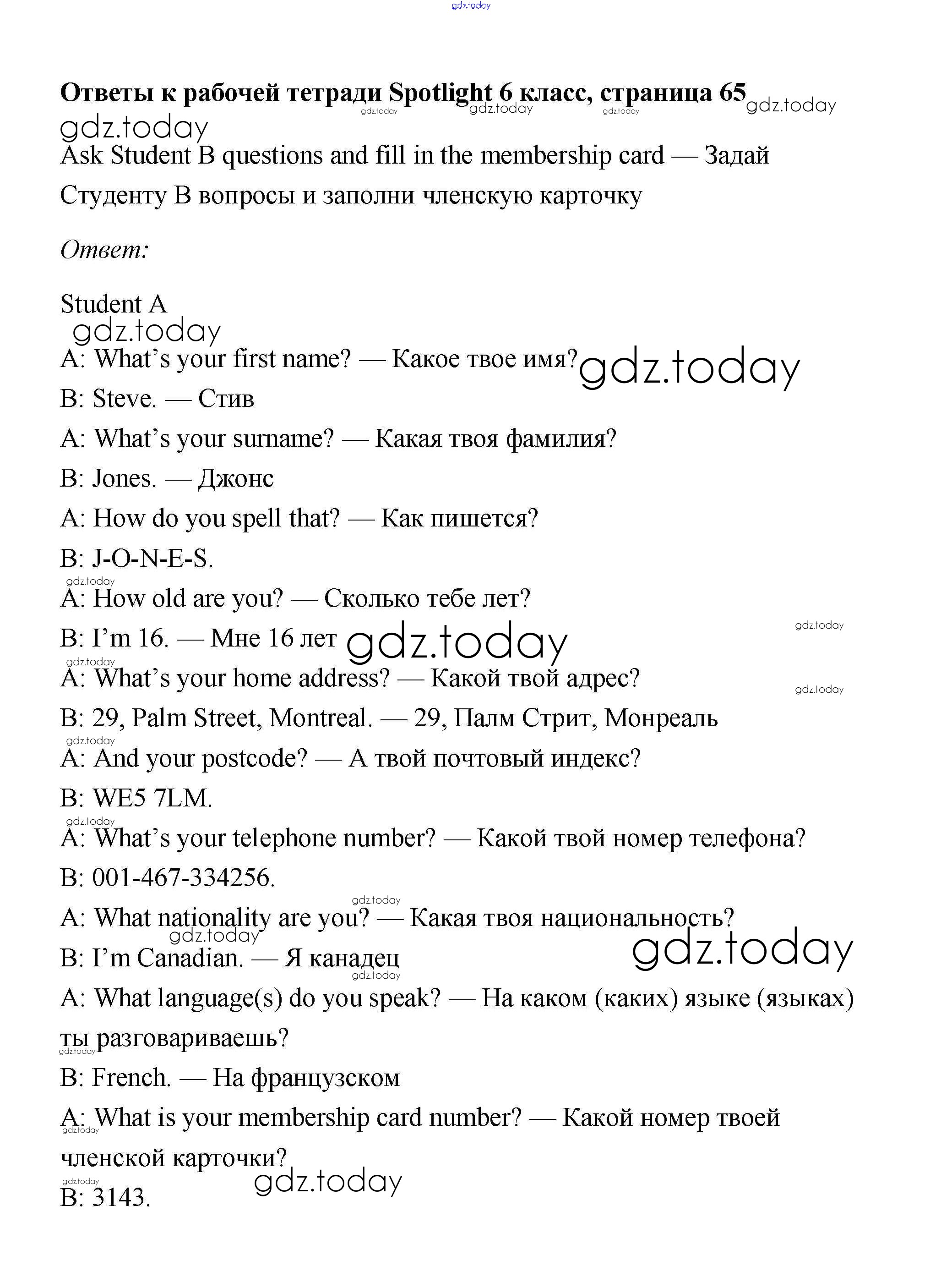 Ответы к Страницы (решение) 65 Рабочей тетради по Английскому языку для 6 класса Эванс, Дули Просвещение Spotlight 2011