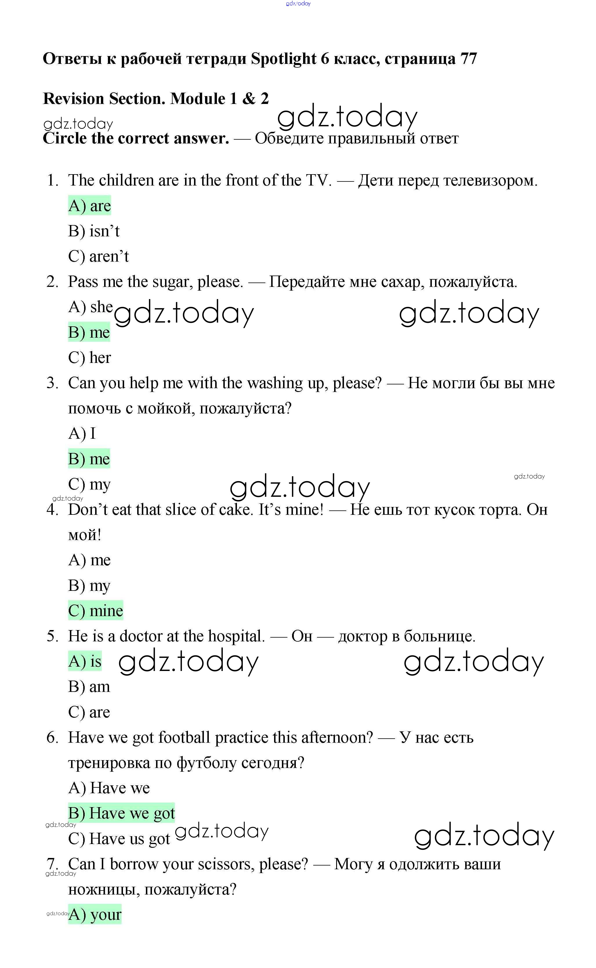 На страницах сайта gdz.today вы найдете учебный и вспомогательный материал, направленный на улучшения знаний школьной программы. ГДЗ - онлайн мир знаний Страницы (решение) 77 Рабочей тетради по Английскому языку для 6 класса Эванс, Дули Просвещение Spotlight 2011