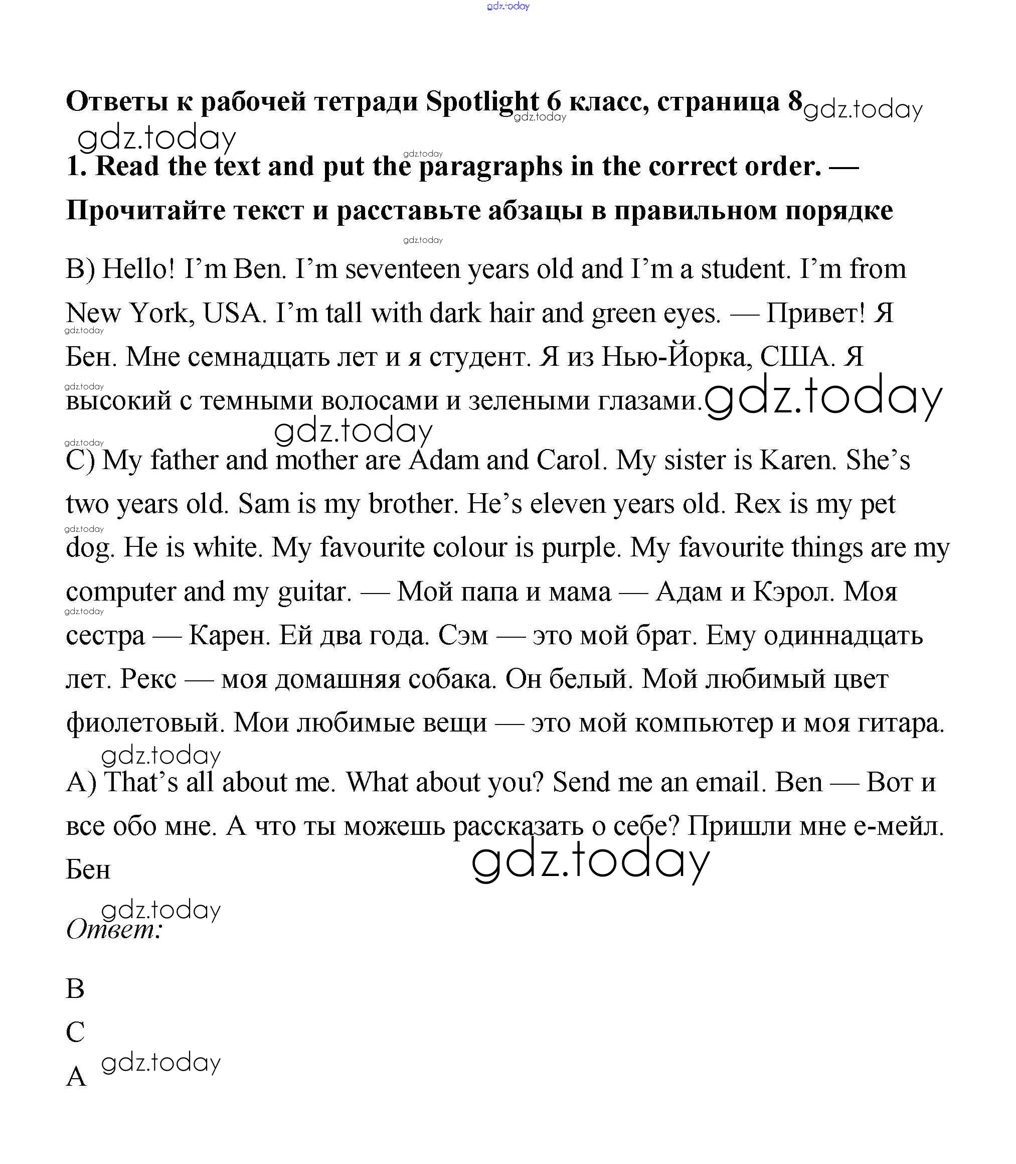 Ответы к Страницы (решение) 8 Рабочей тетради по Английскому языку для 6 класса Эванс, Дули Просвещение Spotlight 2011
