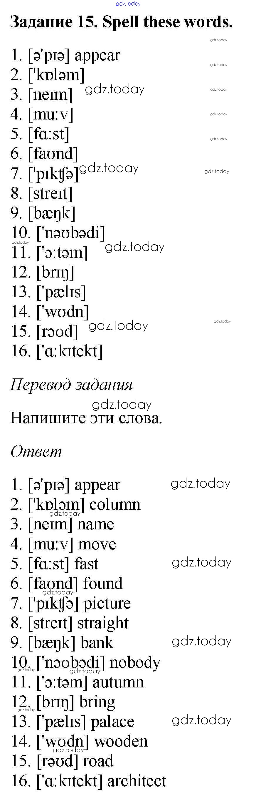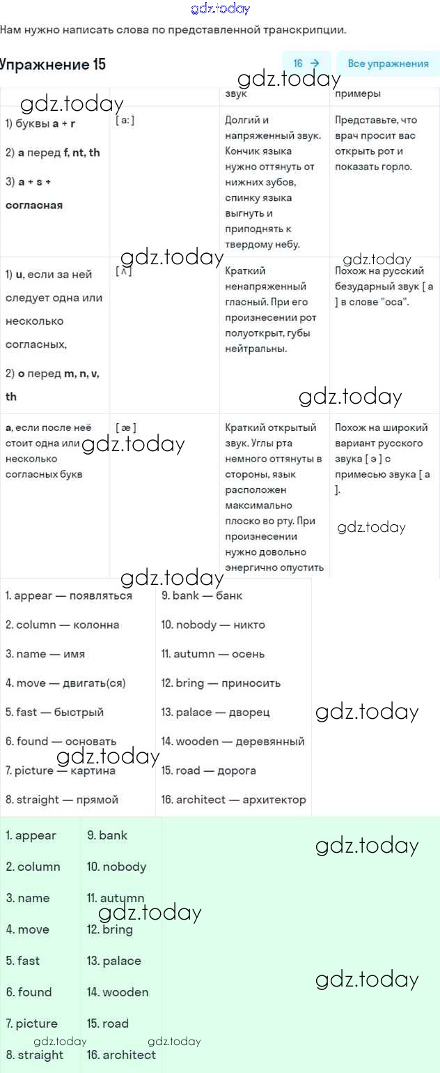 На страницах сайта gdz.today вы найдете учебный и вспомогательный материал, направленный на улучшения знаний школьной программы. ГДЗ - онлайн мир знаний Решение. Unit One 15 Рабочей тетради по Английскому языку для 6 класса Афанасьева, Михеева Дрофа Rainbow 2017