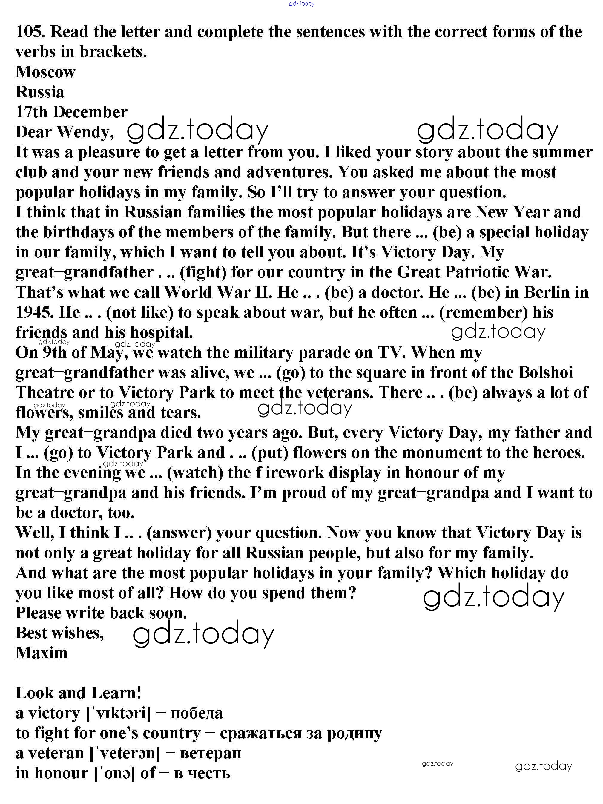 На страницах сайта gdz.today вы найдете учебный и вспомогательный материал, направленный на улучшения знаний школьной программы. ГДЗ - онлайн мир знаний Exercises Unit 1 105 Учебнику по Английскому языку для 6 класса Биболетова, Денисенко Титул, Дрофа Enjoy English 2015, 2019
