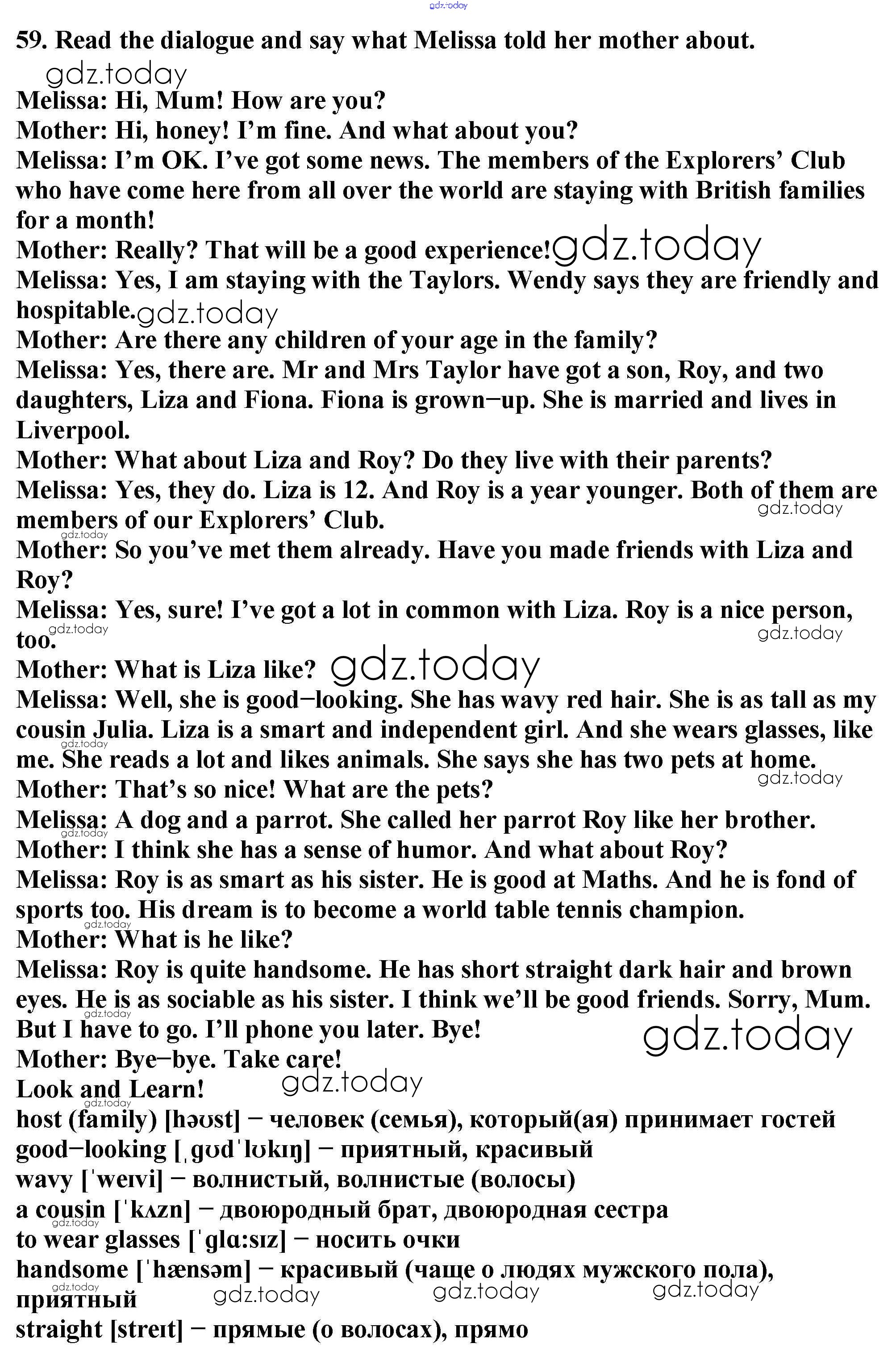 На страницах сайта gdz.today вы найдете учебный и вспомогательный материал, направленный на улучшения знаний школьной программы. ГДЗ - онлайн мир знаний Exercises Unit 1 59 Учебнику по Английскому языку для 6 класса Биболетова, Денисенко Титул, Дрофа Enjoy English 2015, 2019