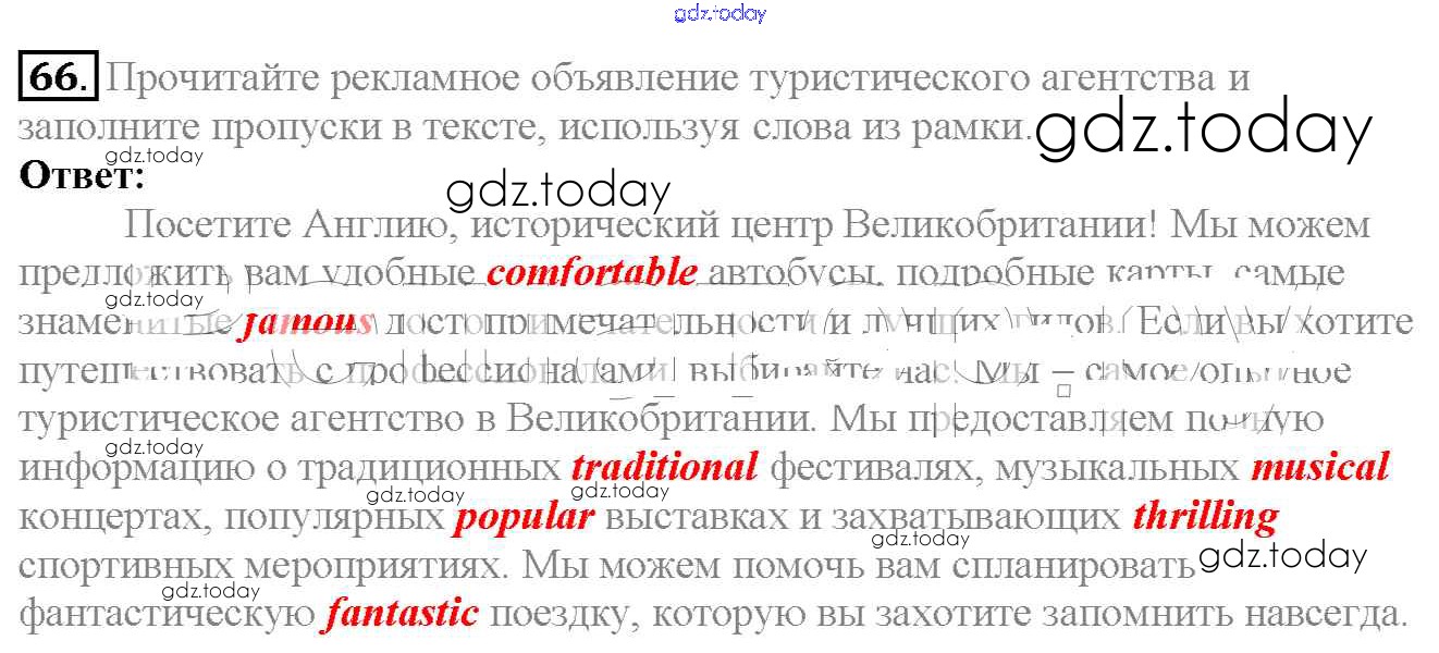 На страницах сайта gdz.today вы найдете учебный и вспомогательный материал, направленный на улучшения знаний школьной программы. ГДЗ - онлайн мир знаний Exercises Unit 3 66 Учебнику по Английскому языку для 6 класса Биболетова, Денисенко Титул, Дрофа Enjoy English 2015, 2019