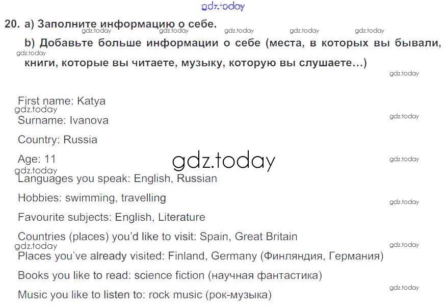 На страницах сайта gdz.today вы найдете учебный и вспомогательный материал, направленный на улучшения знаний школьной программы. ГДЗ - онлайн мир знаний Exercises Unit 1 20 Учебнику по Английскому языку для 6 класса Биболетова, Денисенко Титул, Дрофа Enjoy English 2015, 2019