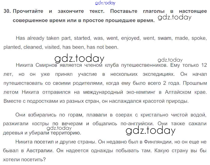 На страницах сайта gdz.today вы найдете учебный и вспомогательный материал, направленный на улучшения знаний школьной программы. ГДЗ - онлайн мир знаний Exercises Unit 1 30 Учебнику по Английскому языку для 6 класса Биболетова, Денисенко Титул, Дрофа Enjoy English 2015, 2019