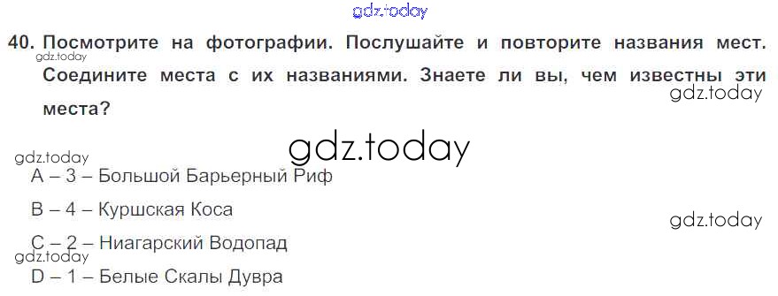 На страницах сайта gdz.today вы найдете учебный и вспомогательный материал, направленный на улучшения знаний школьной программы. ГДЗ - онлайн мир знаний Exercises Unit 1 40 Учебнику по Английскому языку для 6 класса Биболетова, Денисенко Титул, Дрофа Enjoy English 2015, 2019
