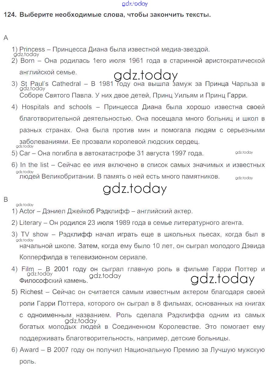 На страницах сайта gdz.today вы найдете учебный и вспомогательный материал, направленный на улучшения знаний школьной программы. ГДЗ - онлайн мир знаний Exercises Unit 3 124 Учебнику по Английскому языку для 6 класса Биболетова, Денисенко Титул, Дрофа Enjoy English 2015, 2019
