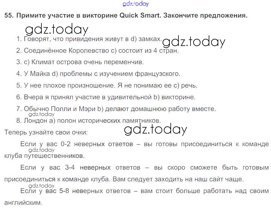 На страницах сайта gdz.today вы найдете учебный и вспомогательный материал, направленный на улучшения знаний школьной программы. ГДЗ - онлайн мир знаний Exercises Unit 3 55 Учебнику по Английскому языку для 6 класса Биболетова, Денисенко Титул, Дрофа Enjoy English 2015, 2019