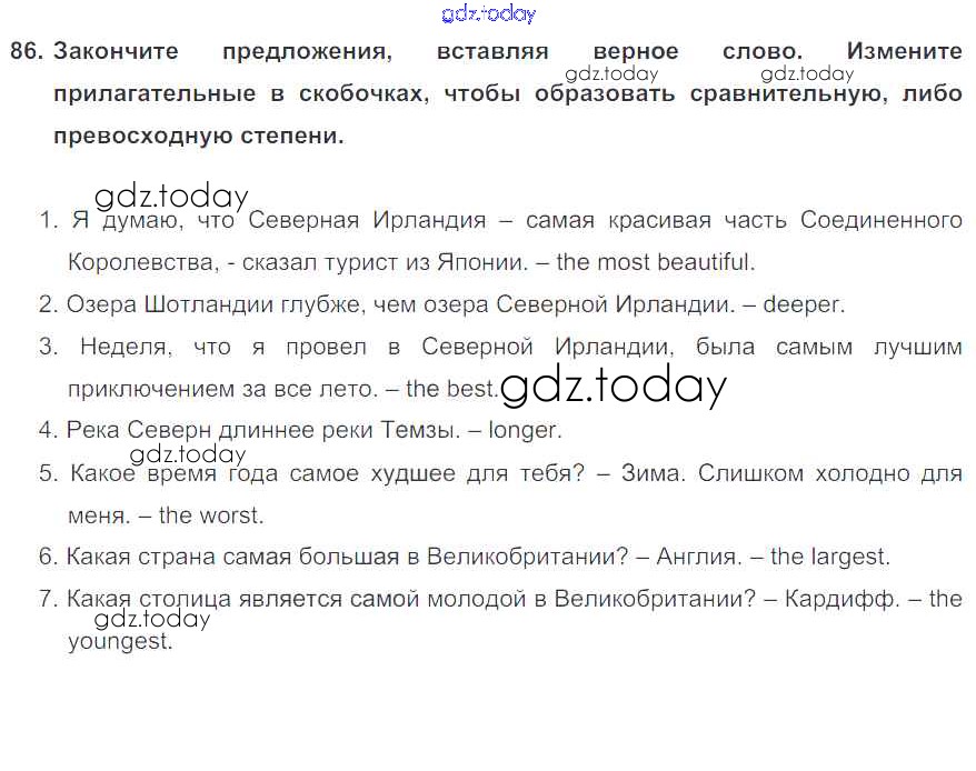 На страницах сайта gdz.today вы найдете учебный и вспомогательный материал, направленный на улучшения знаний школьной программы. ГДЗ - онлайн мир знаний Exercises Unit 3 86 Учебнику по Английскому языку для 6 класса Биболетова, Денисенко Титул, Дрофа Enjoy English 2015, 2019