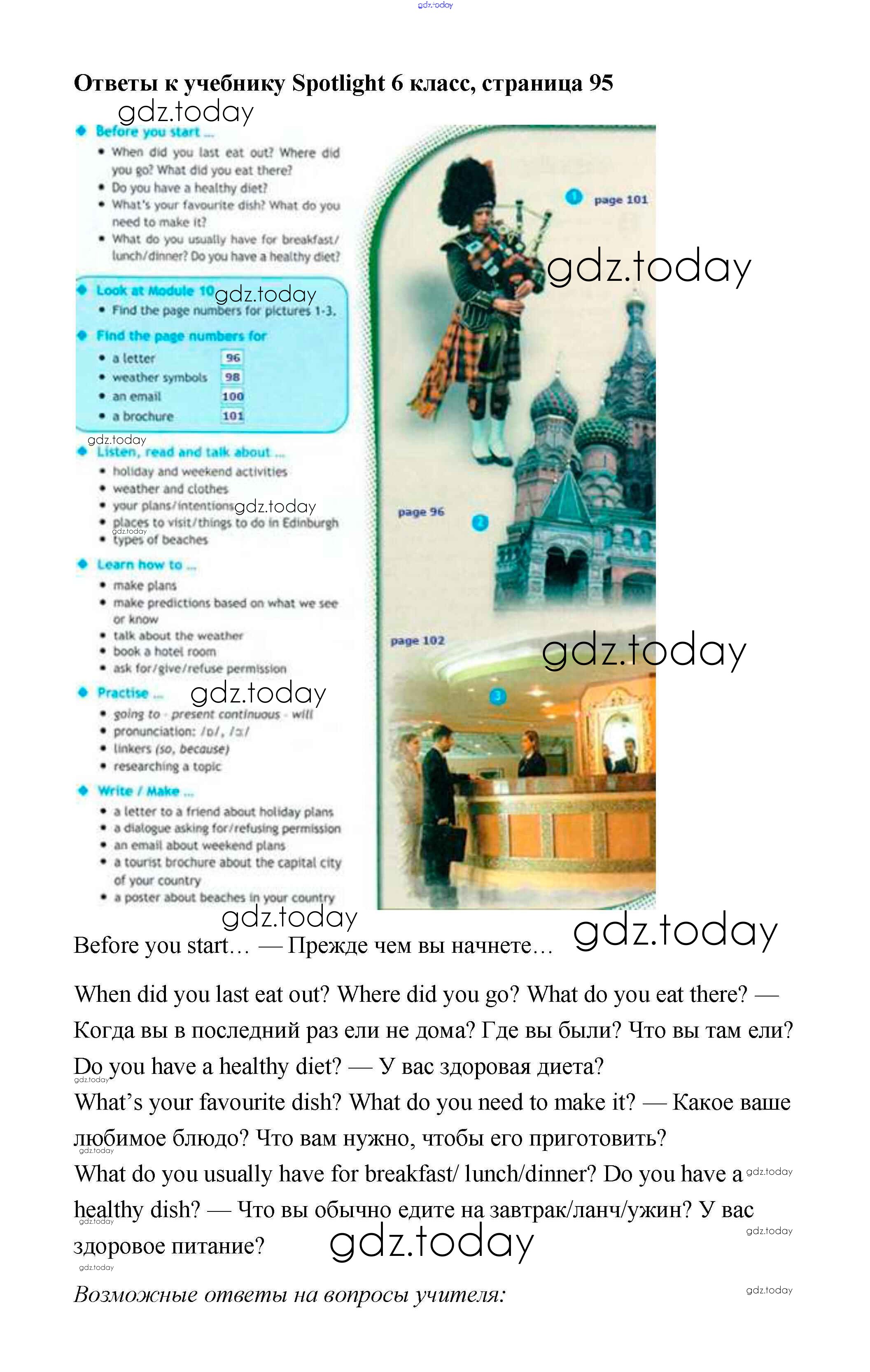 На страницах сайта gdz.today вы найдете учебный и вспомогательный материал, направленный на улучшения знаний школьной программы. ГДЗ - онлайн мир знаний Решение к Module 10. Holiday Time. Страницы 95 Учебнику по Английскому языку для 6 класса Ваулина, Дули Просвещение Spotlight 2017