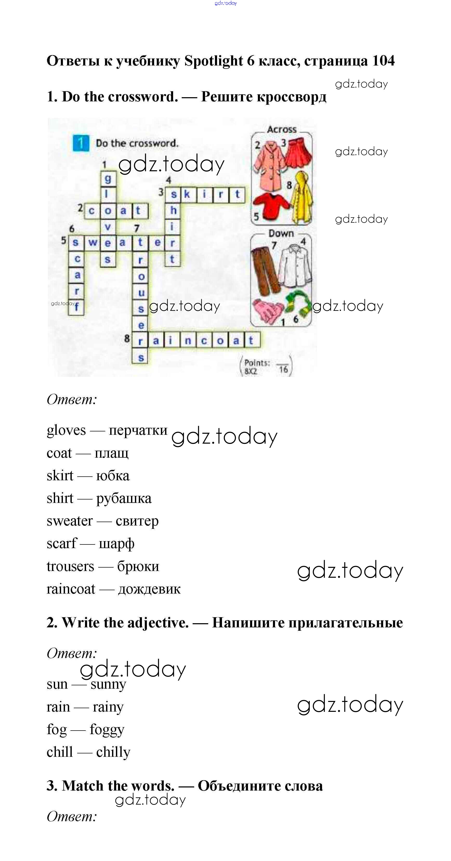 На страницах сайта gdz.today вы найдете учебный и вспомогательный материал, направленный на улучшения знаний школьной программы. ГДЗ - онлайн мир знаний Решение к Module 10. Holiday Time. Страницы 104 Учебнику по Английскому языку для 6 класса Ваулина, Дули Просвещение Spotlight 2017