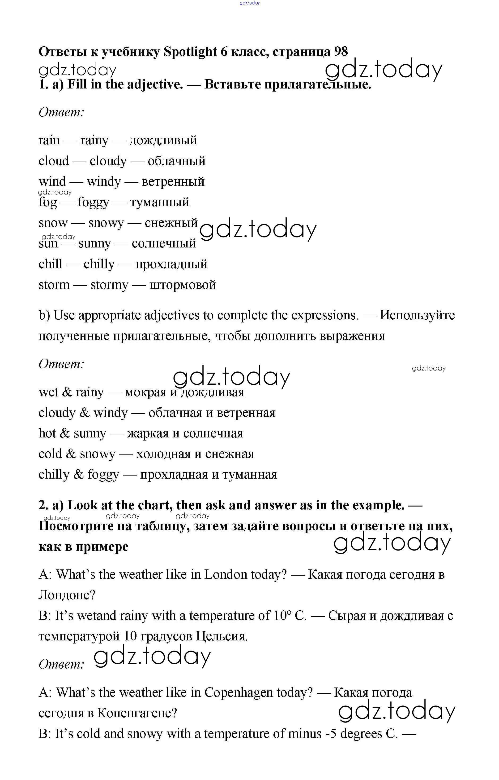На страницах сайта gdz.today вы найдете учебный и вспомогательный материал, направленный на улучшения знаний школьной программы. ГДЗ - онлайн мир знаний Решение к Module 10. Holiday Time. Страницы 98 Учебнику по Английскому языку для 6 класса Ваулина, Дули Просвещение Spotlight 2017